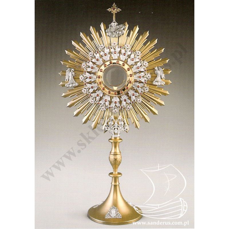 Monstrancja mosiężna, pozłacana o wysokości 77 cm i średnicy tarczy 40 cm.