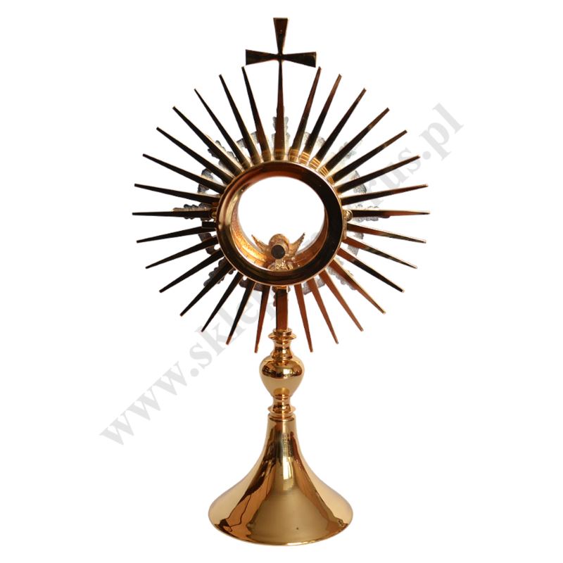 Monstrancja wykonana z odlewu mosiężnego, złoconego, elementy zdobnicze srebrzone. Wysokość monstrancji 42 cm, szerokość 24 cm, średnica w podstawie 12.5 cm, średnica luny na monstrancje 6.8 cm. W komplecie melchizedek.