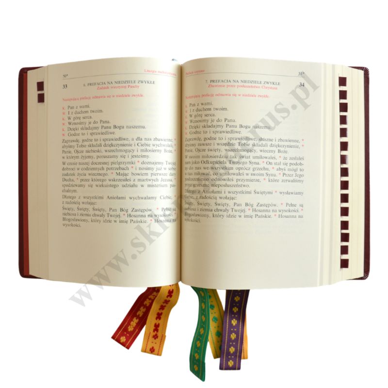 Mszał Rzymski dla diecezji polskich, tzw. "ołtarzowy". Najnowsze wydanie z aktualnymi formularzami mszy św. o świętych. Zawiera także nowe OGÓLNE WPROWADZENIE DO MSZAŁU RZYMSKIEGO i uaktualnione kalendarium.