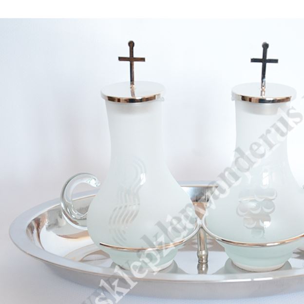 Komplet szklanych ampułek, piaskowanych wraz z metalową tacką. Tacka oraz korki ampułek są niklowane.