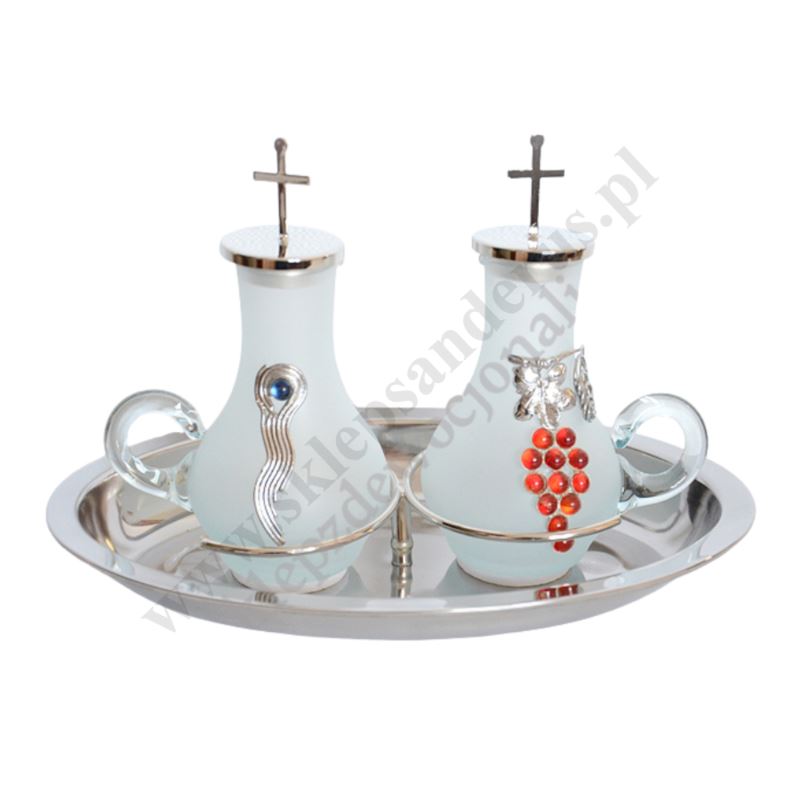 Komplet szklanych ampułek, piaskowanych zdobionych metaloplastyką srebrzoną wraz z metalową tacką. Tacka wraz z korkami ampułek są niklowane.