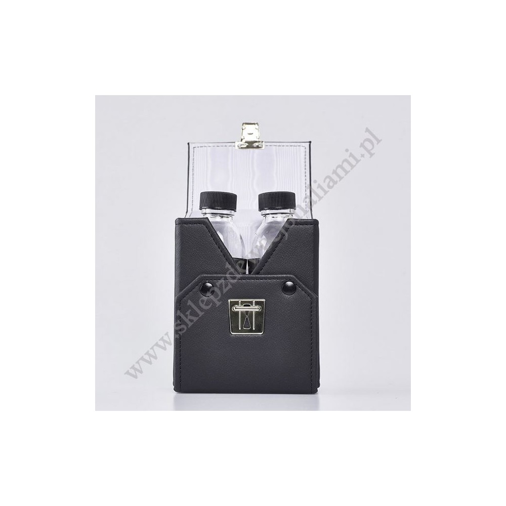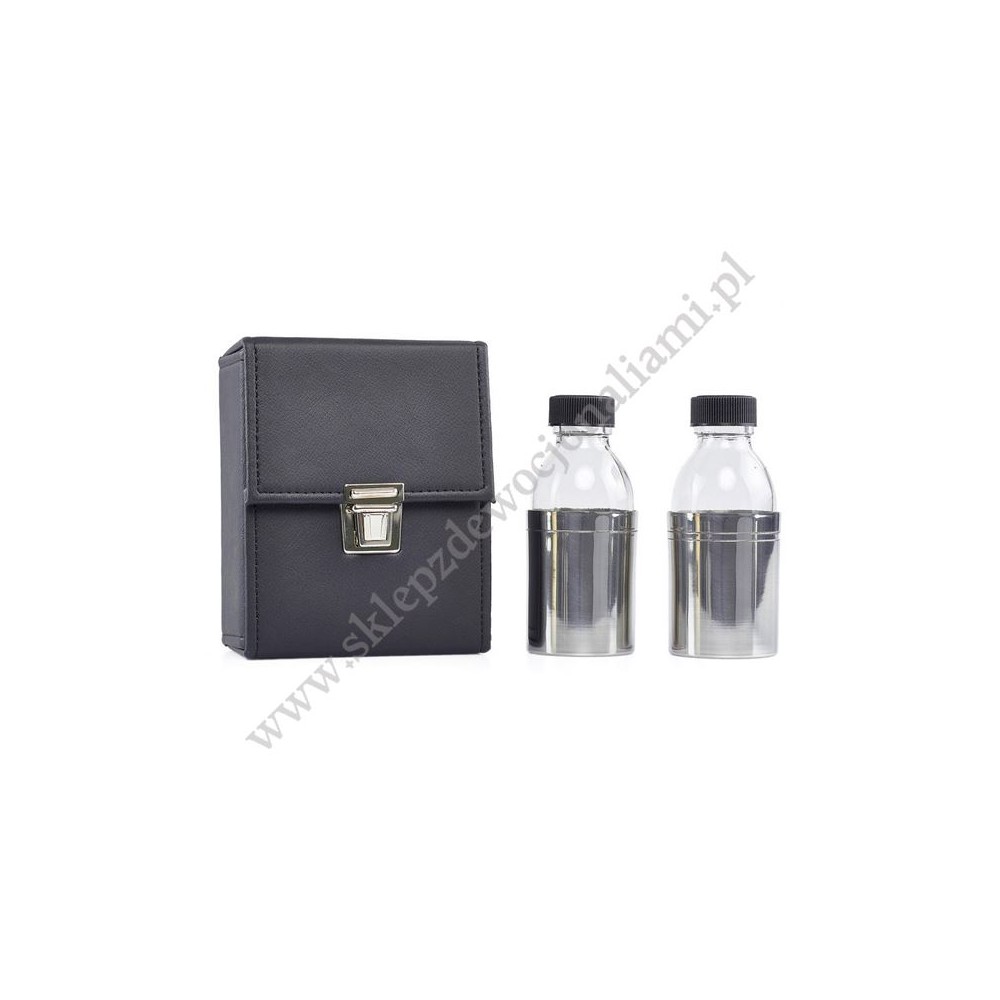 Zestaw podwójny butelek na oleje święte w etui. Butelki zakręcane, szklane w metalowej osłonie.
