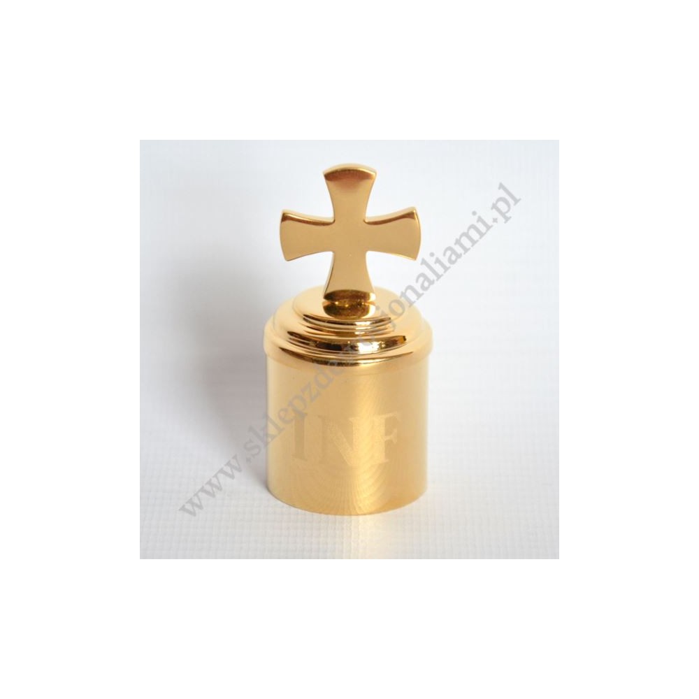 Pojemnick na olej święty wykonany z mosiądzu, pozłacany o wysokości 6.2 cm (mierzona z krzyżykiem) i średnicy 3 cm.