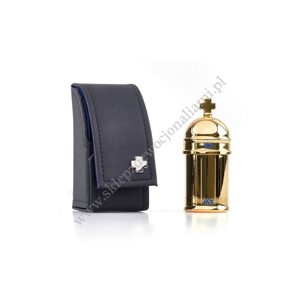 Pojemnik na olej w etui skórzanym. Ręcznie wykonany szklany wkład. Zakręcane zamknięcie. Etui estetyczne, starannie wykonane, stebnowane brzegi.