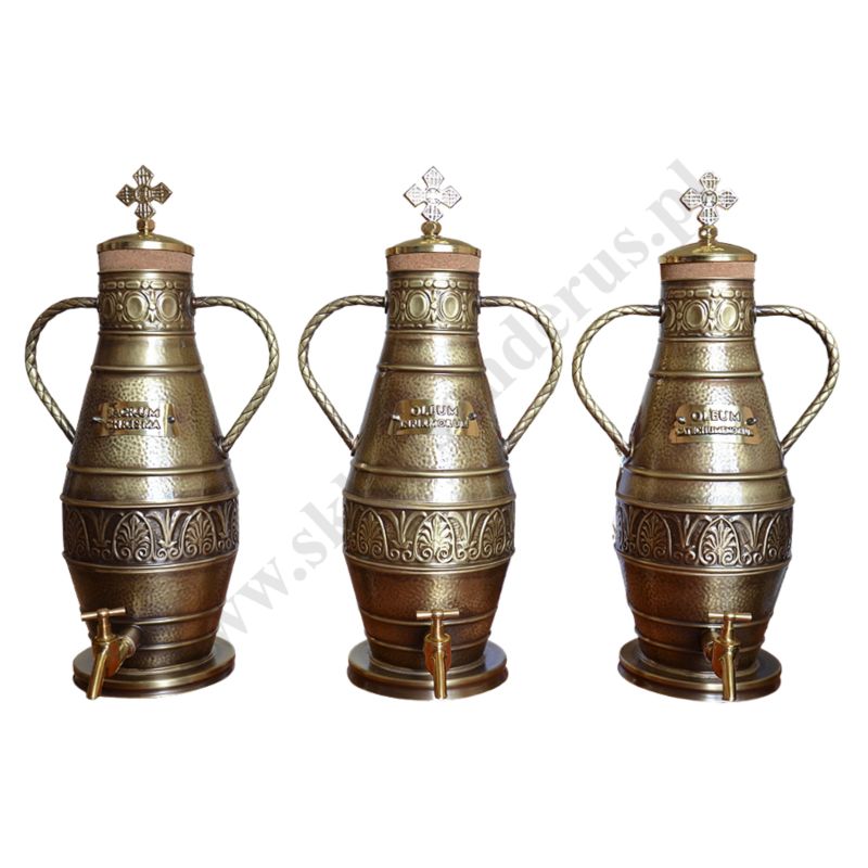 Komplet trzech pojemników na oleje święte z kranikiem wykonane z blachy mosiężnej o pojemności 7 litrów każdy. Na każdym pojemniku widnieje napis na jaki olej jest przeznaczony: Sacrum Chrisma, Oleum Infirmorum, Oleum Catechumenorum.