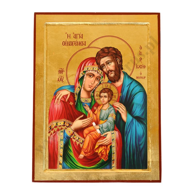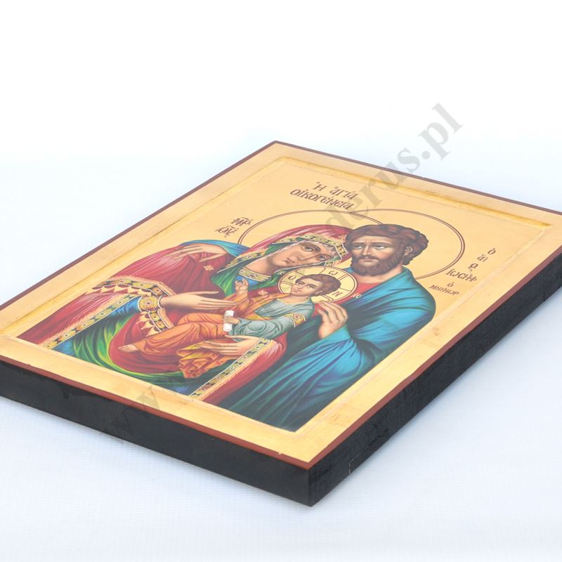 Ikona przedstawiająca wizerunek Świętej Rodziny w wymiarze 30 x 40 cm. PONIŻEJ W PRODUKTACH POWIĄZANYCH ISTNIEJE MOŻLIWOŚĆ ZAMÓWIENIA OKAZJONALNEJ DEDYKACJI NA TABLICZCE SREBRNEJ LUB ZŁOTEJ.