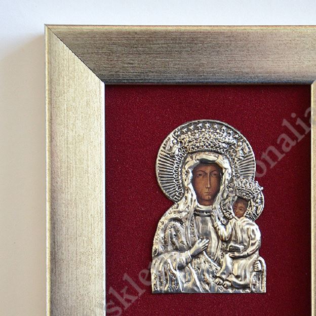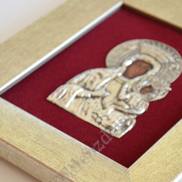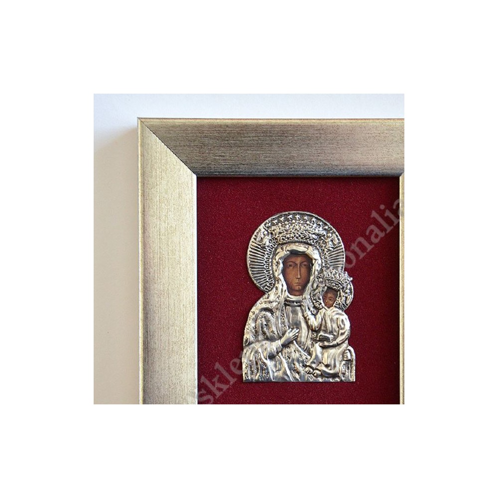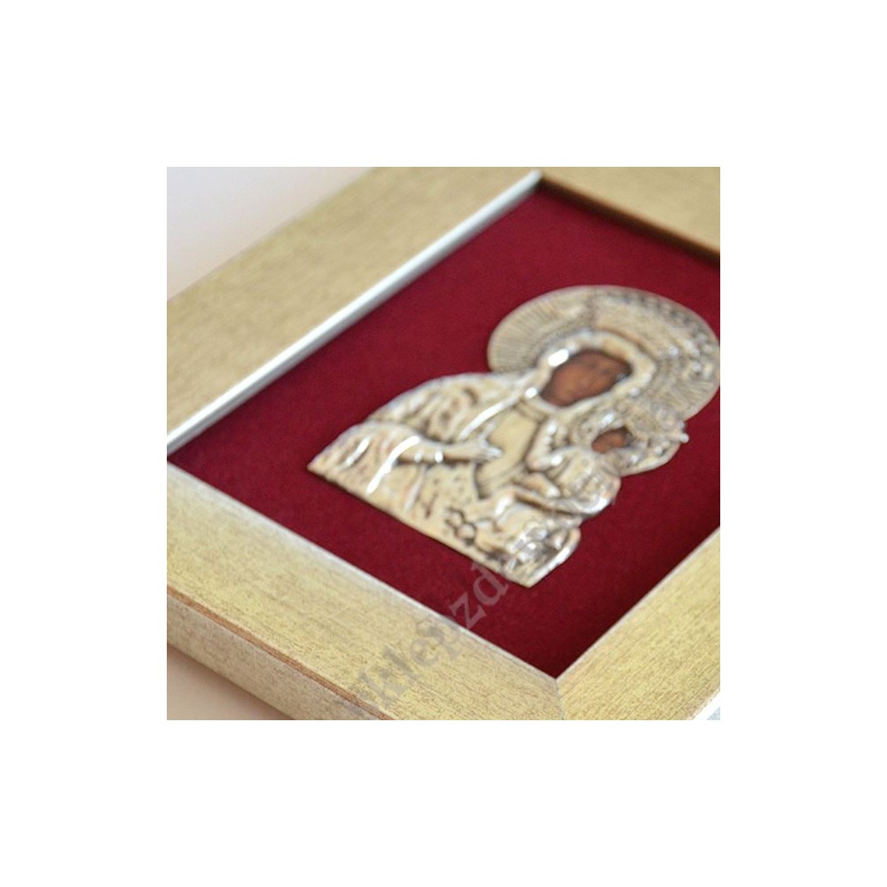 Obraz Matki Bożej Częstochowskiej w formacie 14.7 cm x 16.5 cm wykonany w metaloplastyce za szybą w drewnianej ramie. PONIŻEJ W PRODUKTACH POWIĄZANYCH ISTNIEJE MOŻLIWOŚĆ ZAMÓWIENIA OKAZJONALNEJ DEDYKACJI NA SPECJALNEJ TABLICZCE.