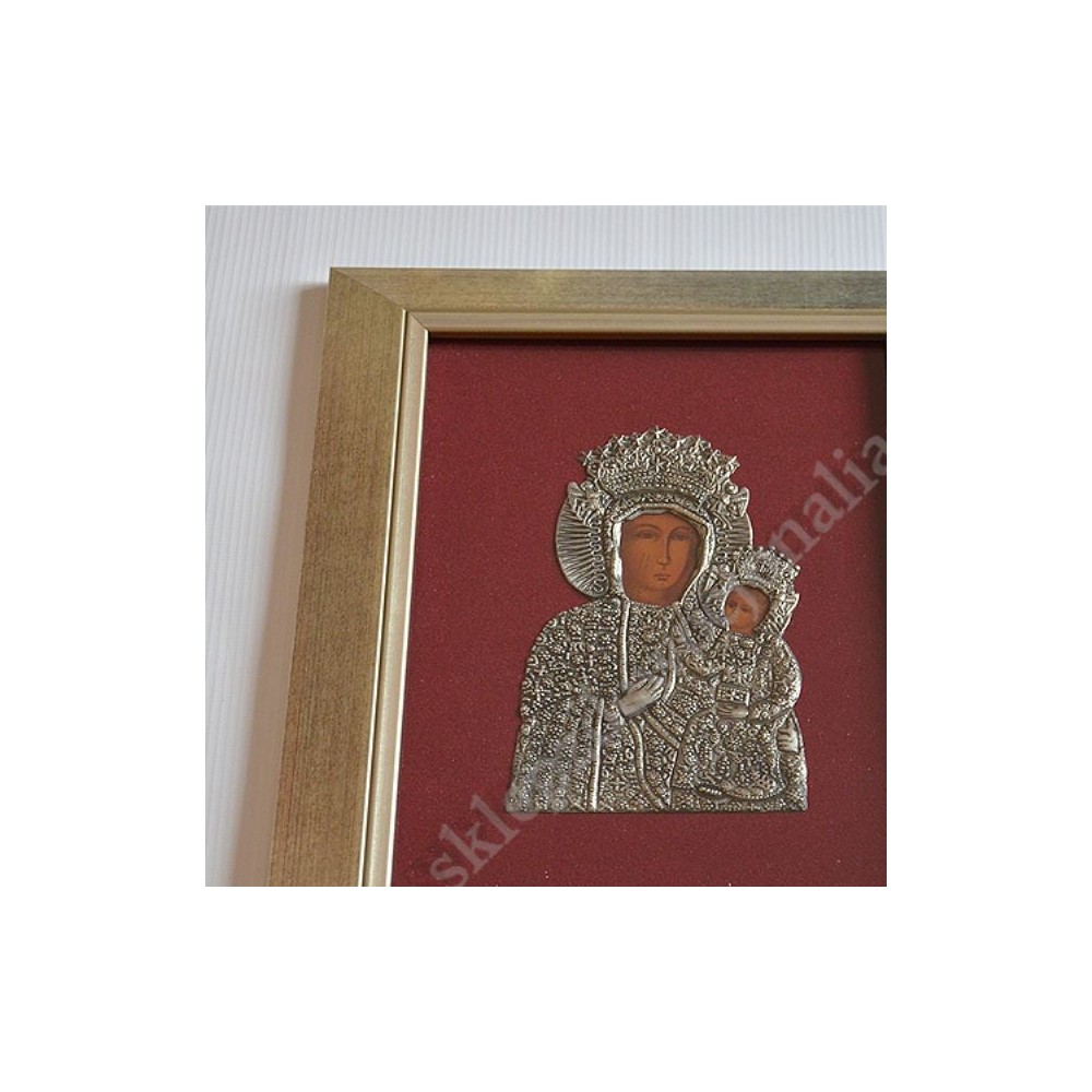 Obraz Matki Bożej Częstochowskiej w formacie 25 cm x 31 cm wykonany w metaloplastyce za szybą w drewnianej ramie. PONIŻEJ W PRODUKTACH POWIĄZANYCH ISTNIEJE MOŻLIWOŚĆ ZAMÓWIENIA OKAZJONALNEJ DEDYKACJI NA SPECJALNEJ TABLICZCE.