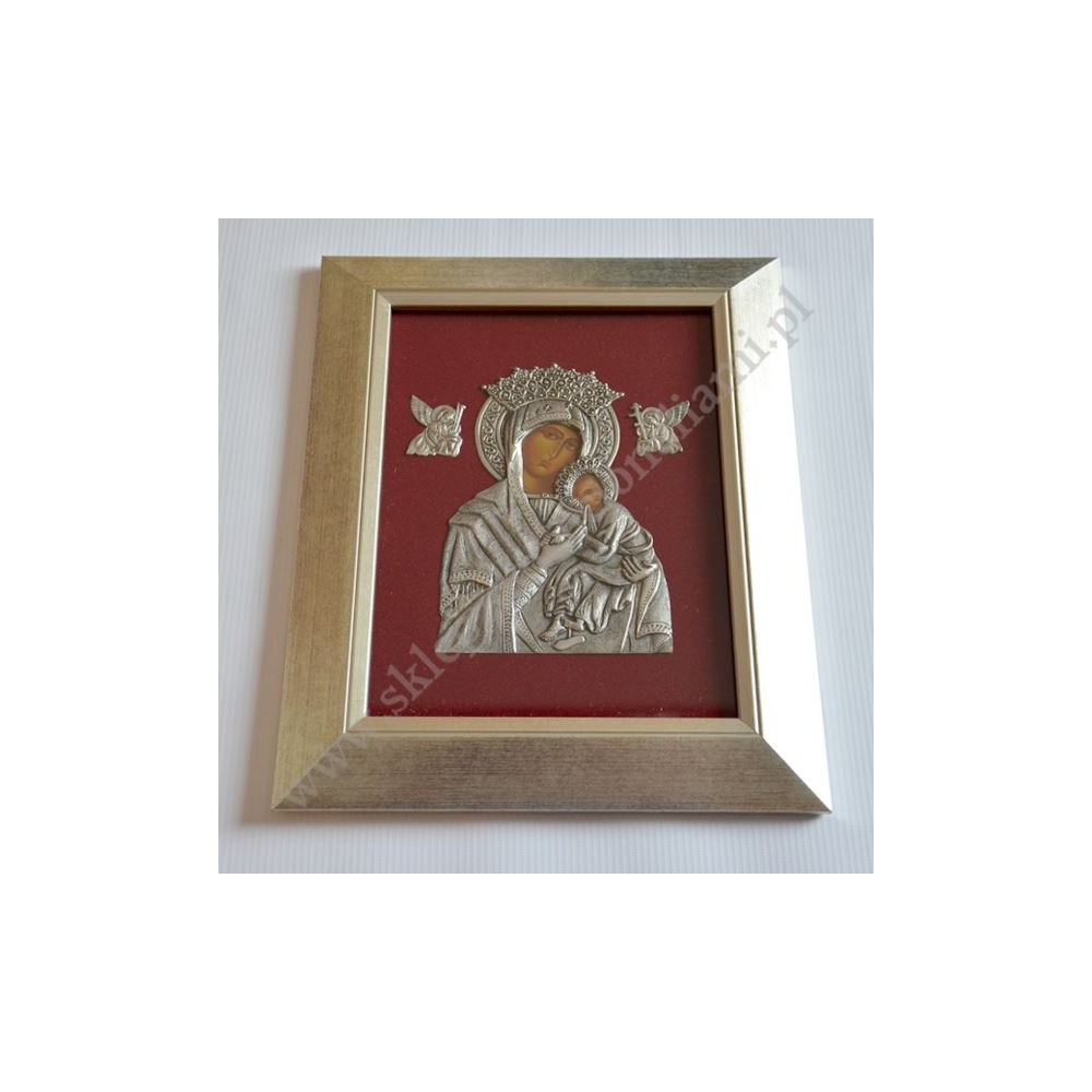 Obraz Matki Bożej Nieustającej Pomocy w formacie 25 cm x 31 cm wykonany w metaloplastyce za szybą w drewnianej ramie.