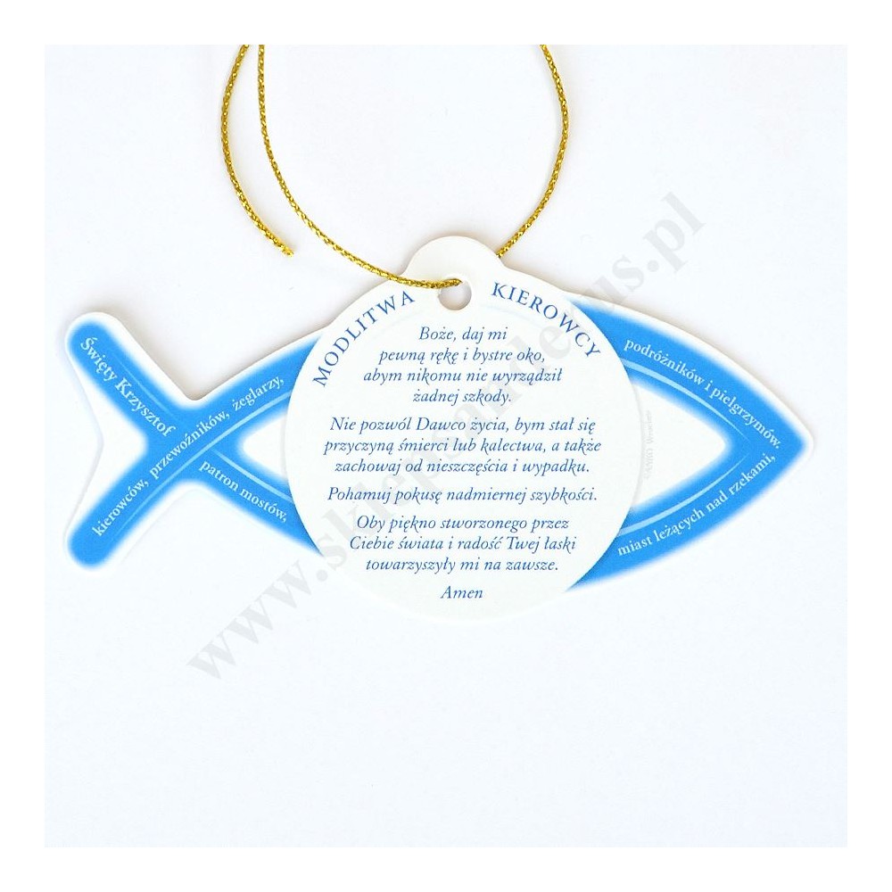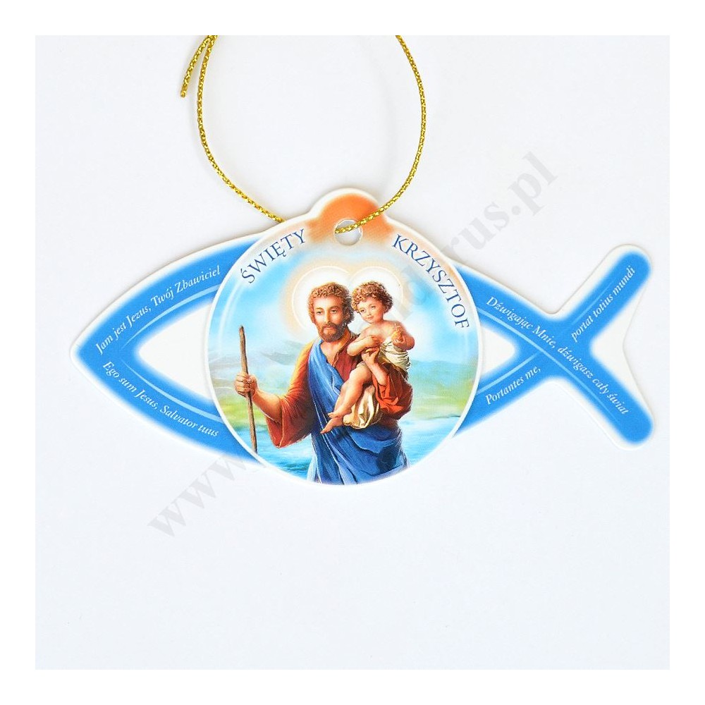 Zawieszka Świętego Krzysztofa wykonana z cienkiego plastiku o wymiarch 10.3 x 5.3 cm.