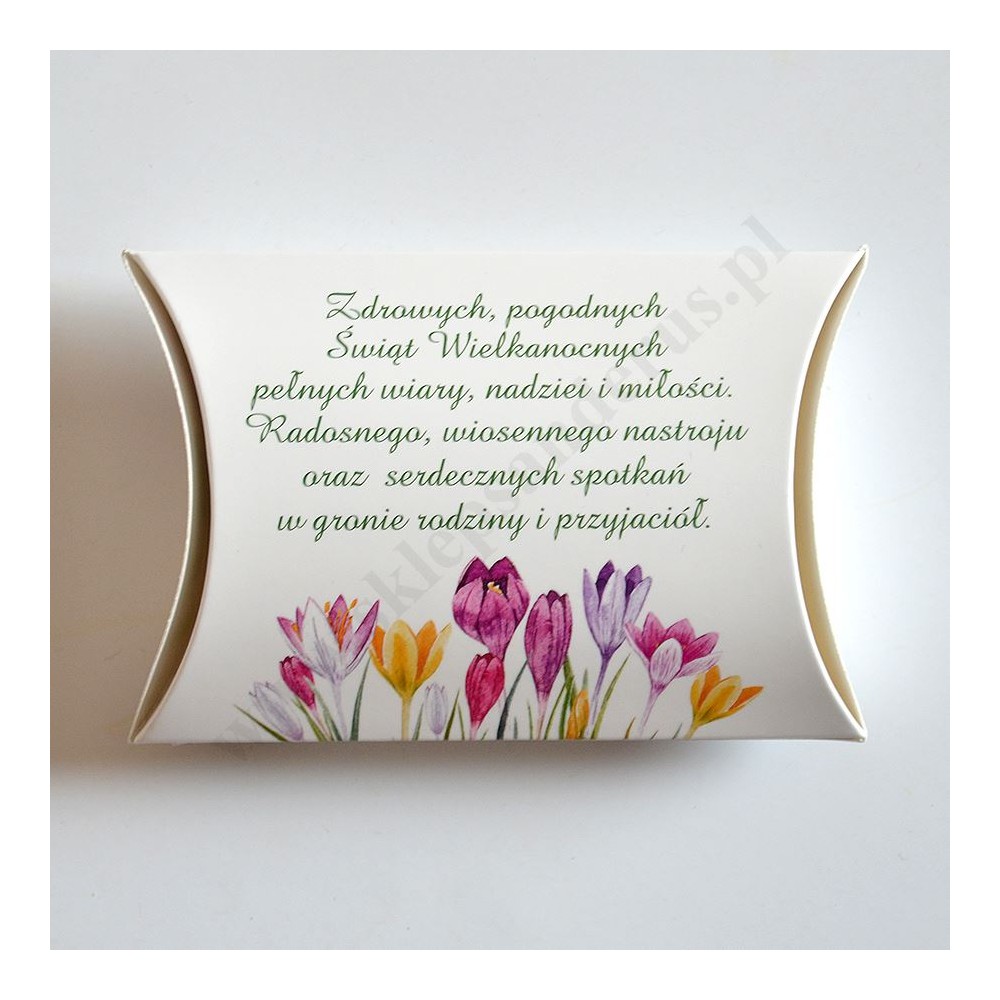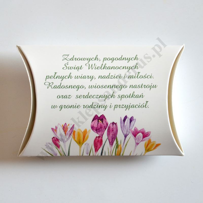 Trzy krówki z sentencjami zapakowane w okazyjny, elegancki kartonik z życzeniami z okazji Świąt Wielkanocnych.