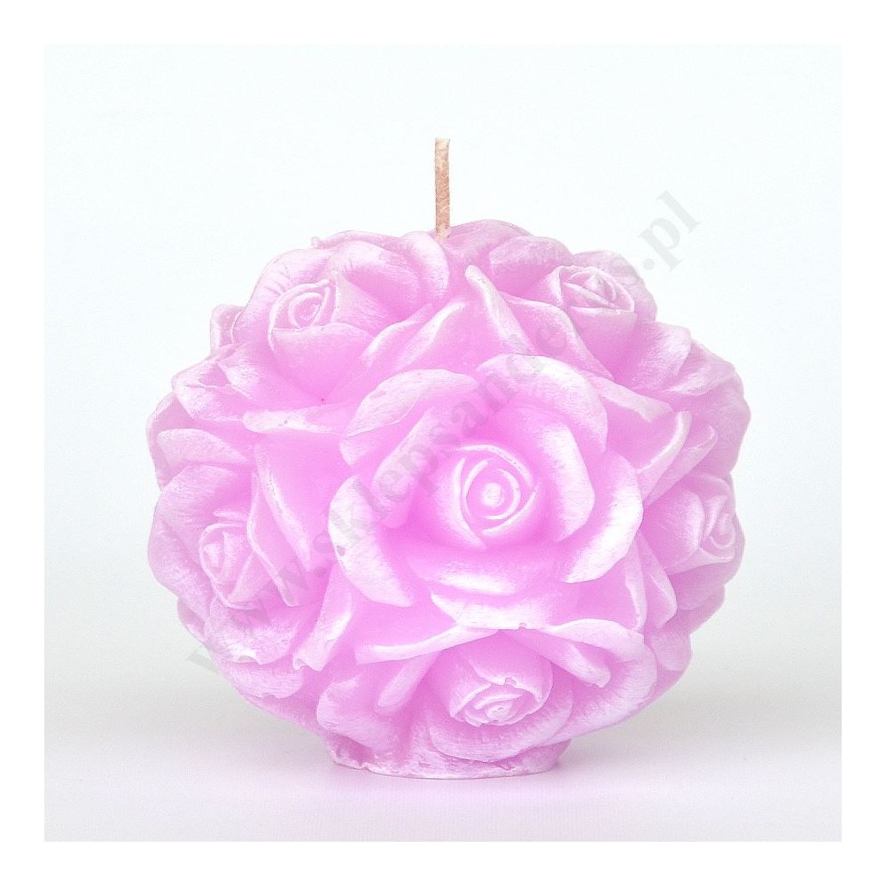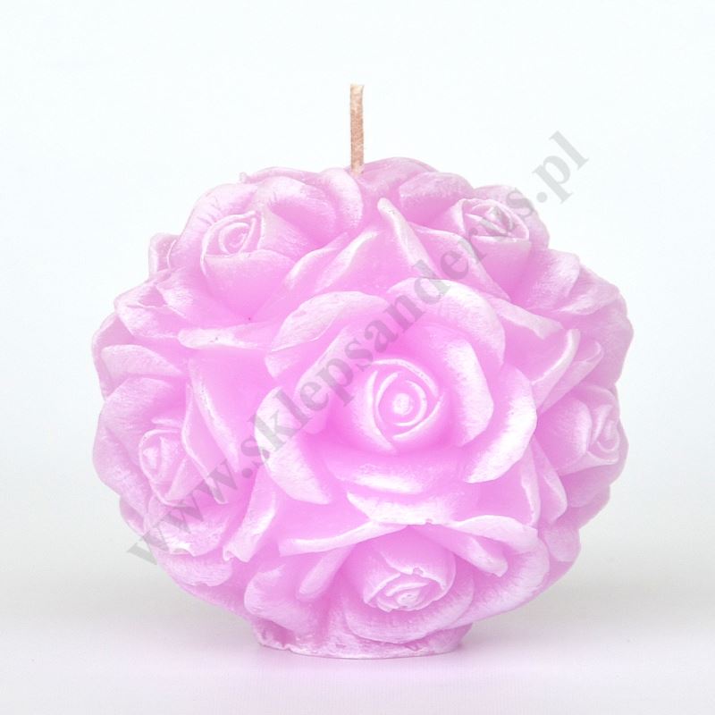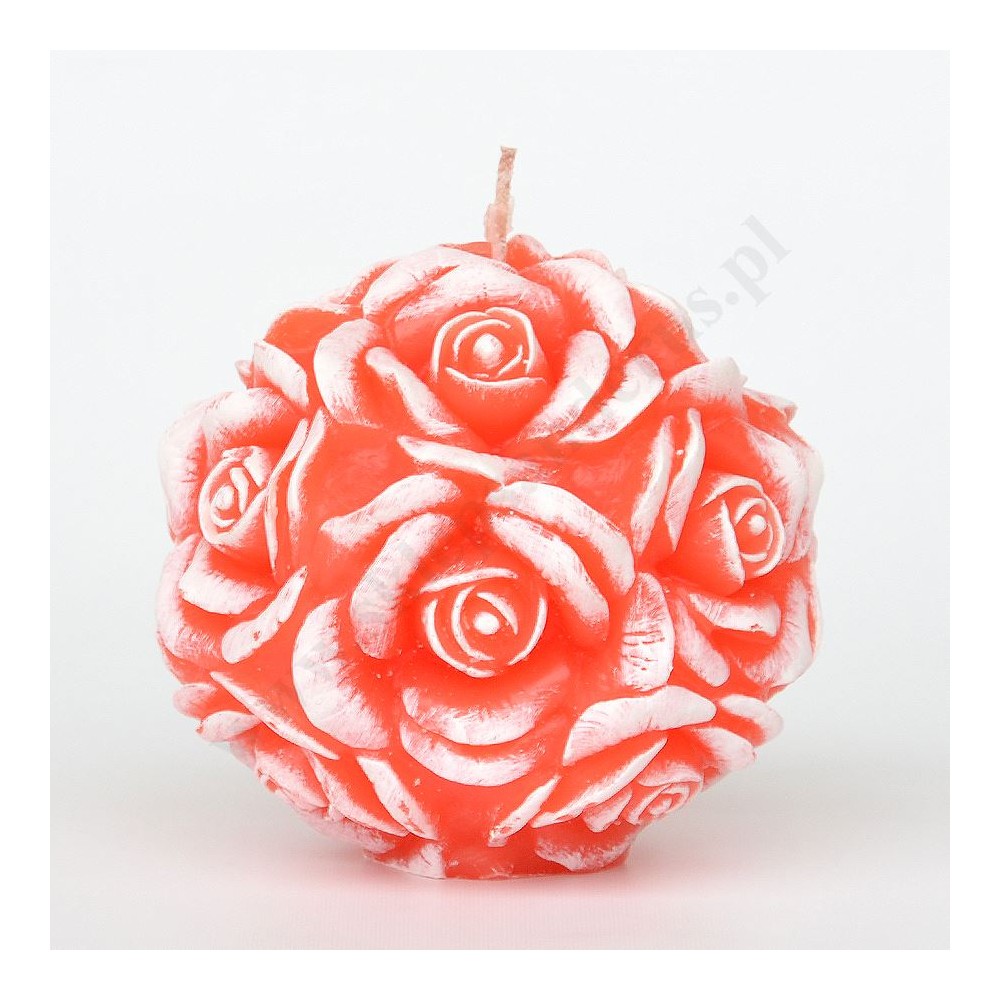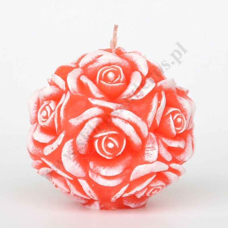 Świeca zapachowa w kształcie kuli kwiatów róż o wysokości 10 cm i szerokości 10 cm, dostępna w dwóch kolorach różowym lub czerwonym.