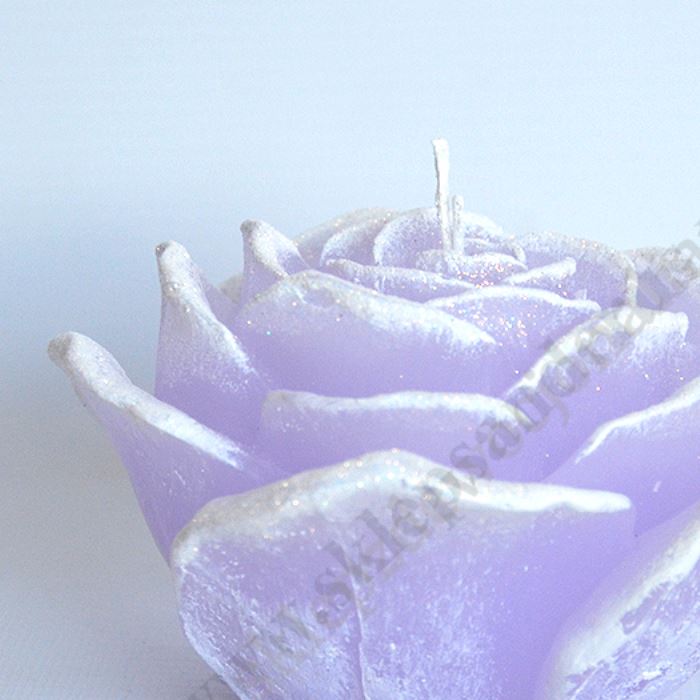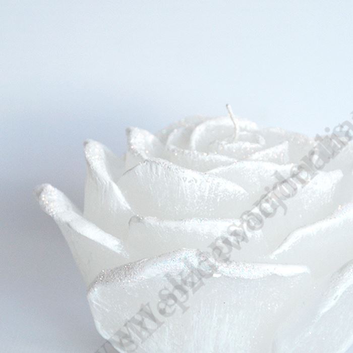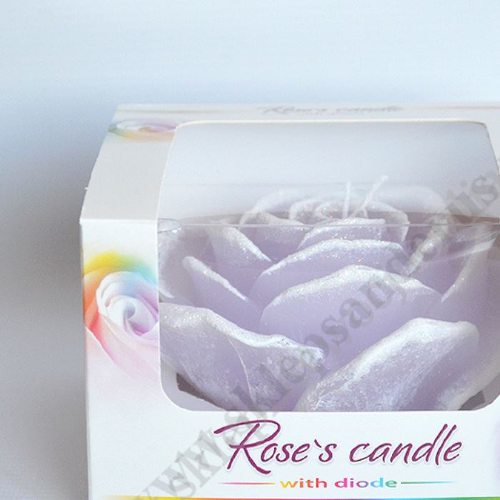 Świeca w formie kwiatu rozwiniętej róży z diodą w środku, która zmienia kolory pod wpływem palącego się knotu. Wysokość świecy 7 cm, szerokość w najszerszym miejscu 11.5 cm. Zapakowana w eleganckie kartonowe pudełko. Sprzedaż w miksie wzorów.