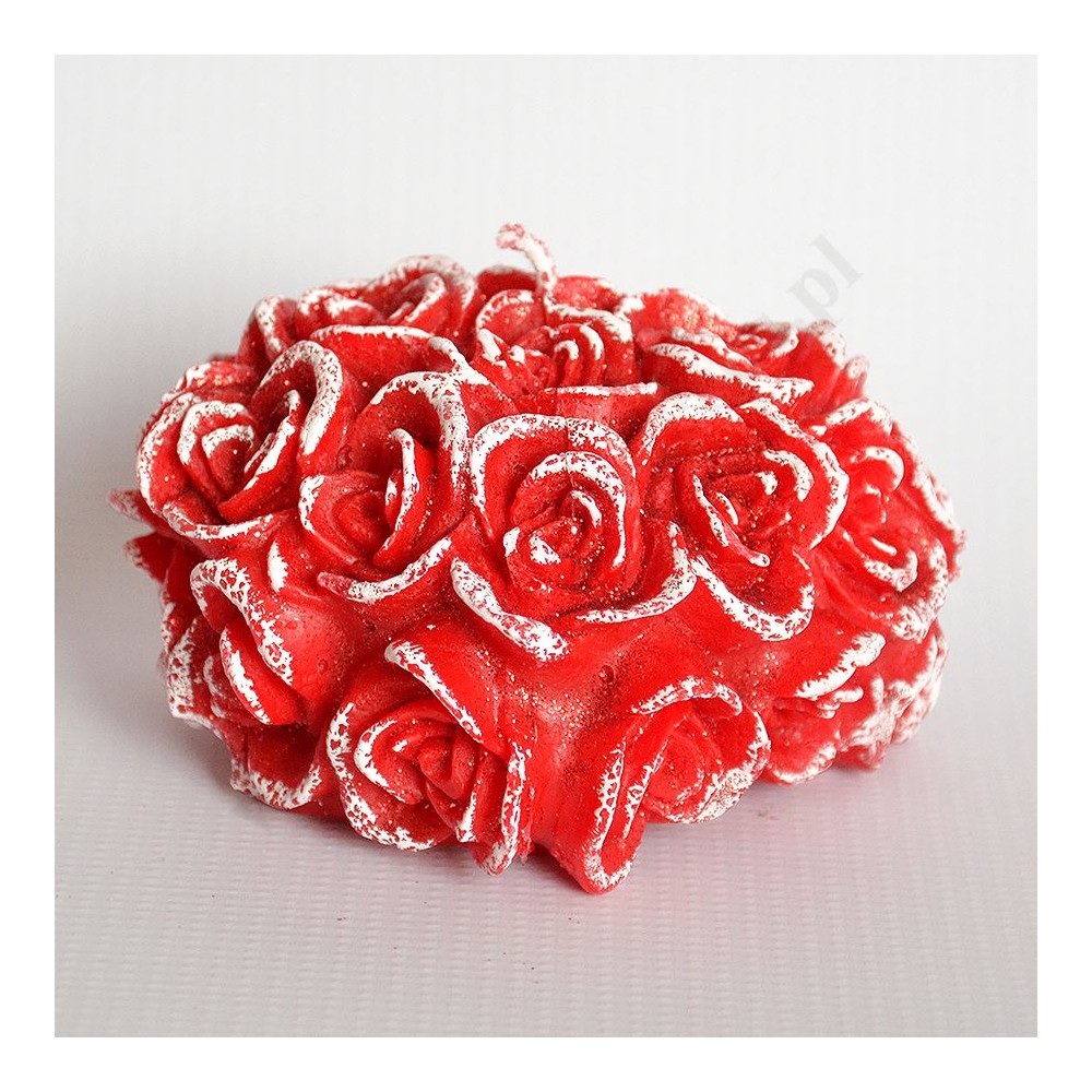Świeca w formie bukietru róż w kształcie serca o wysokości 6 cm i szerokości 12 cm.