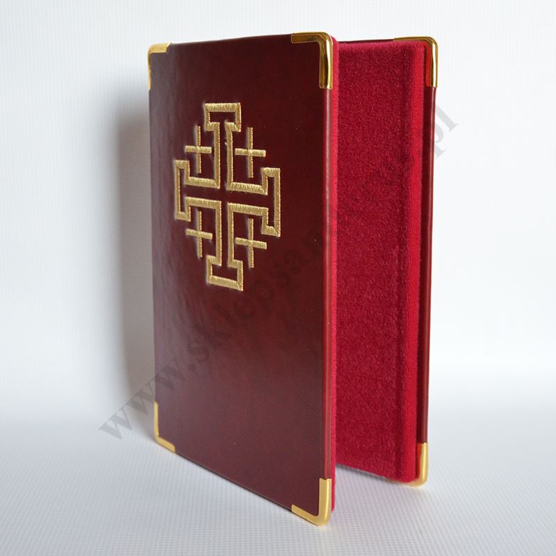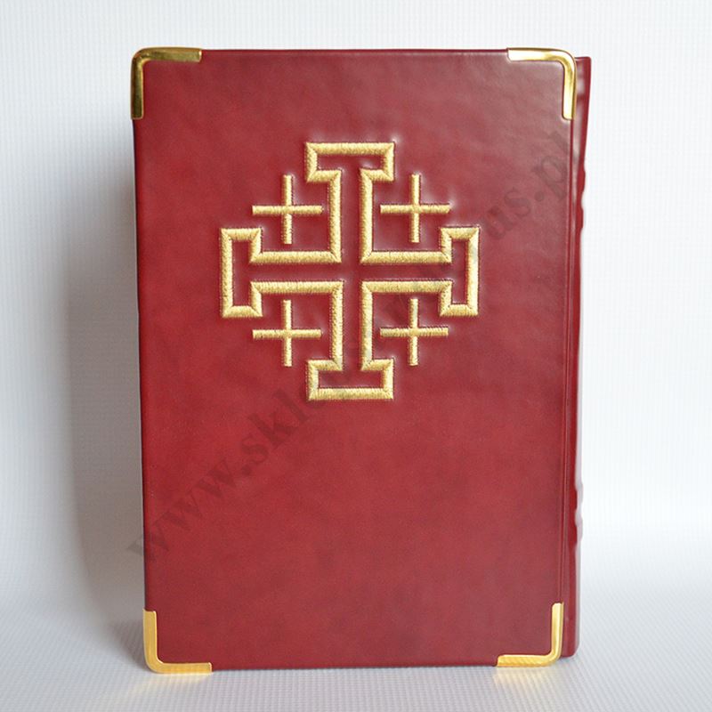Zdobiona okładka liturgiczna w formacie 19 x 26 cm pasująca między innymi na standardowe wydanie lekcjonarzy mszalnych w formacie B5 (bordowe).