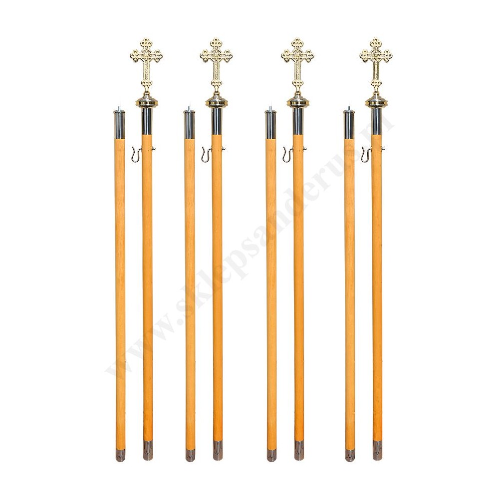 Komplet drzewców skręcanych do baldachimu wraz z okuciami mosiężnymi niklowanymi, drzewce lakierowane. Wysokość drzewca ze zwieńczeniem po skręceniu 273 cm (125 cm + 148 cm).