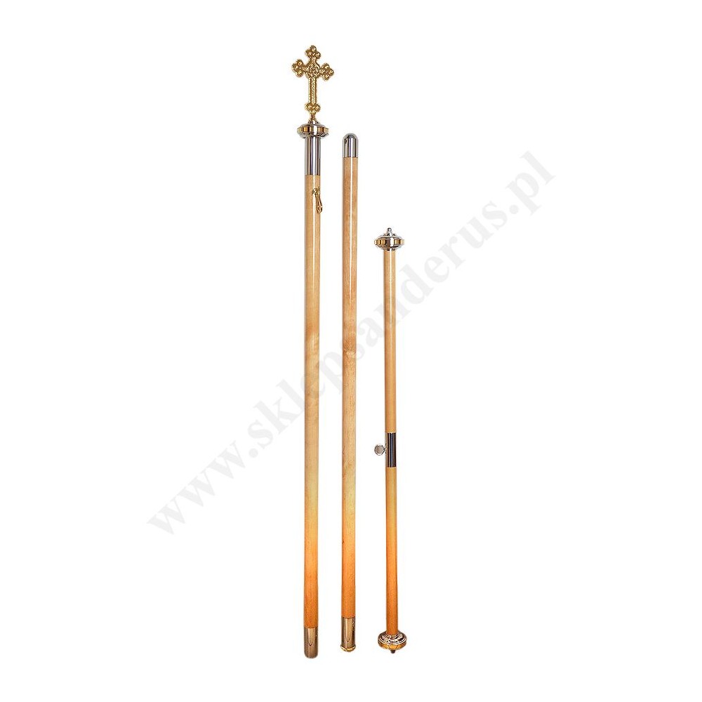 Drzewiec do chorągwi z okuciami mosiężnymi, niklowanymi. Wysokość ze zwieńczeniem krzyża 272 cm, szerokość drzewca poziomego z okuciami 106 cm.
