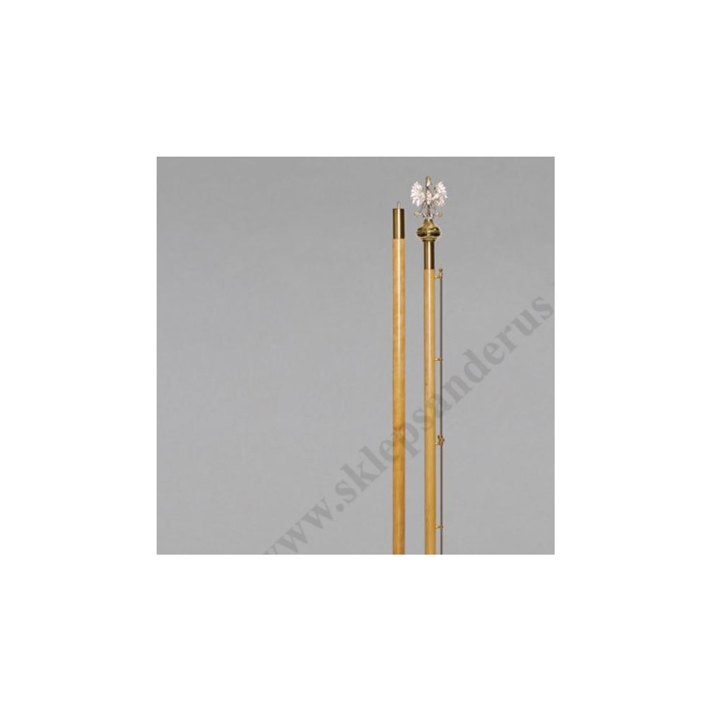 Okucie do sztandaru mosiężne, pozłacane wraz z drzewcem. Wysokość drzewca wraz ze zwieńczeniem po skręceniu ok. 2.7 m (1.24 m + 1.49 m).