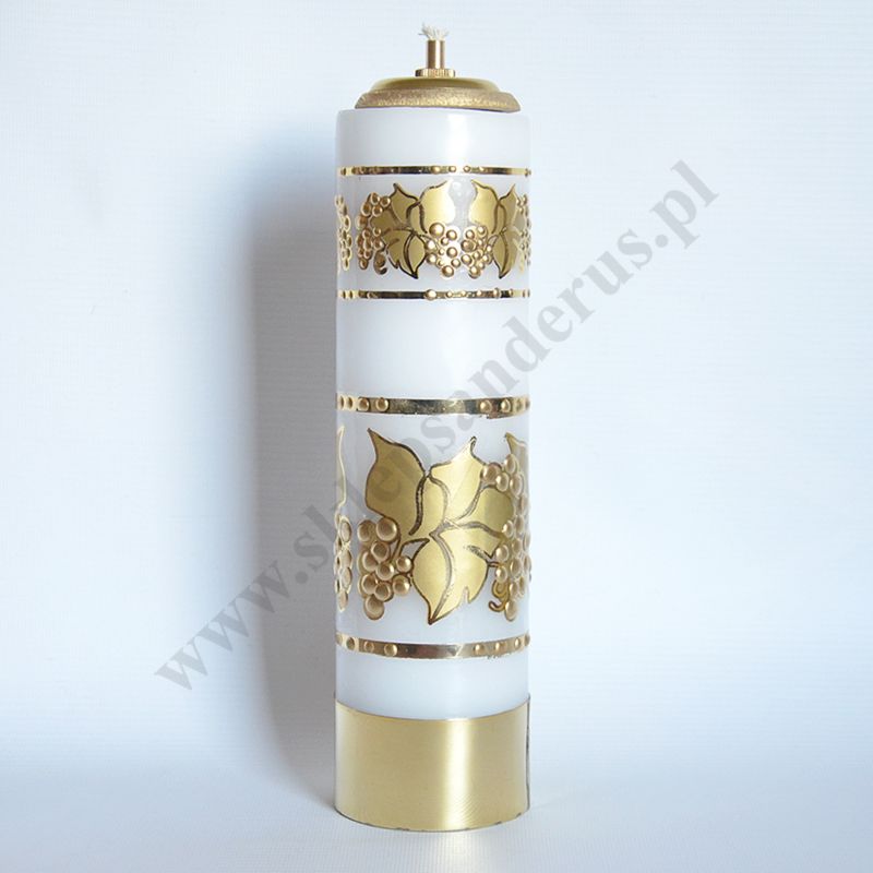 Świeca ołtarzowa olejowa z wkładem olejowym zwykłym o wysokości 27 cm (liczonej z w kładem) i średnicy 7 cm, zdobiona eucharystycznymi ornamentami.