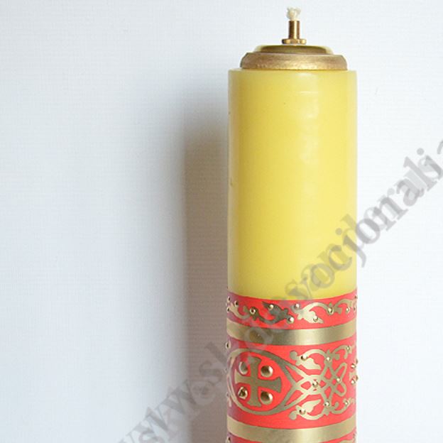 Świeca ołtarzowa z wkładem olejowym o wysokości 30 cm i średnicy 8 cm, zdobiona naklejką z eucharystycznymi ornamentami.
