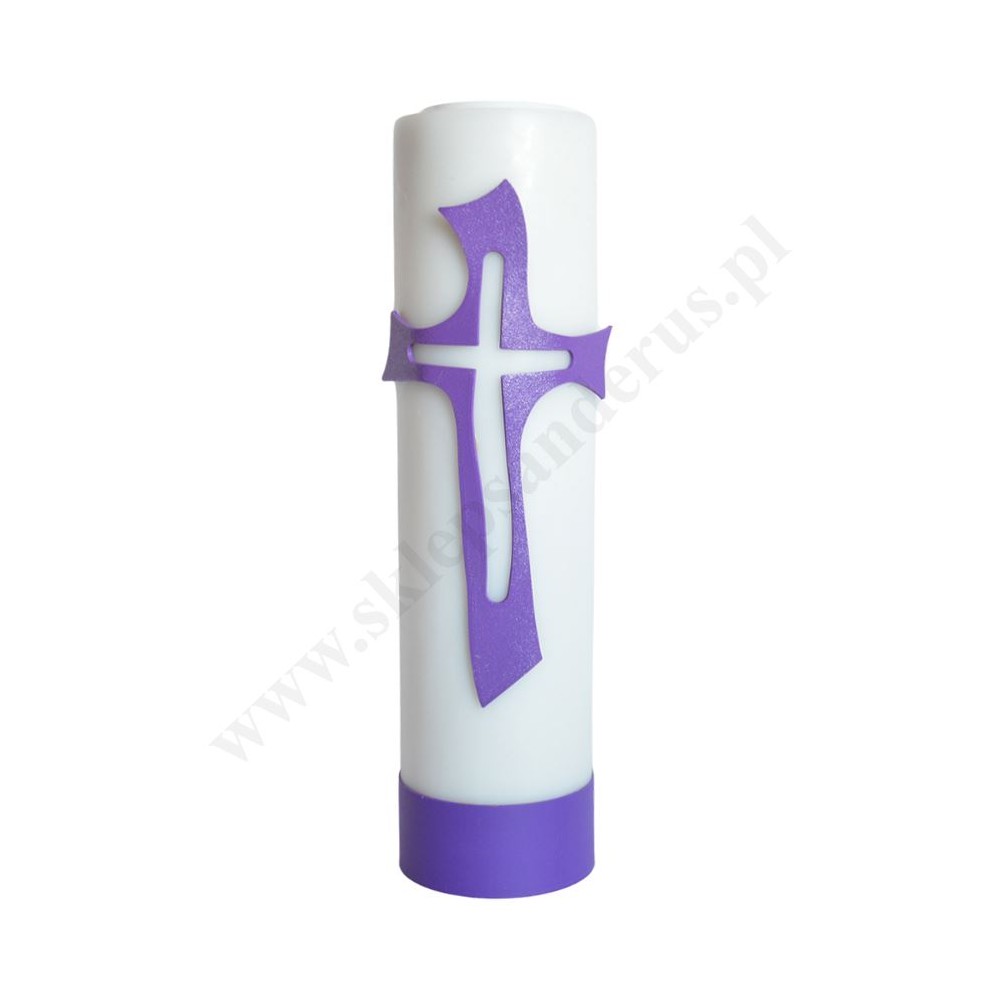 Świeca ołtarzowa olejowa bez wkładu, oblewana parafiną o wysokości 30 cm i średnicy 8 cm, zdobiona aplikacją krzyża.
