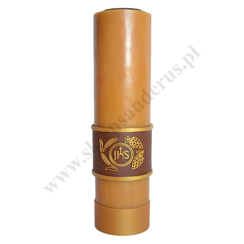Świeca ołtarzowa olejowa bez wkładu, oblewana parafiną o wysokości 30 cm i średnicy 8 cm, zdobiona parafinowym pasem z ornamentami eucharystycznymi.