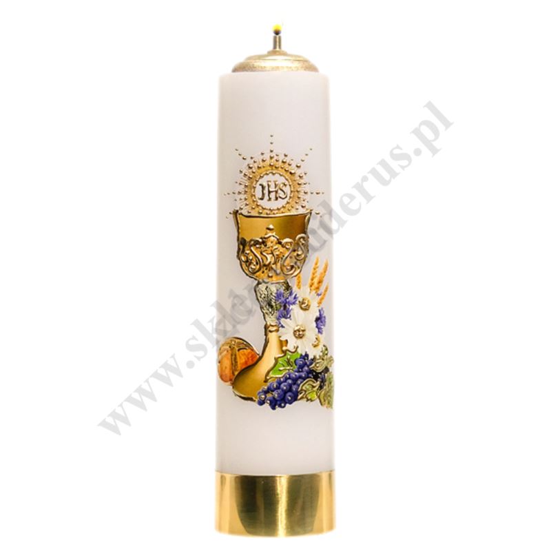 Świeca ołtarzowa z wkładem olejowym o wysokości 30 cm i średnicy 8 cm. Zdobiona aplikacją eucharystyczną, dół świecy zakończony metalowym okuciem.