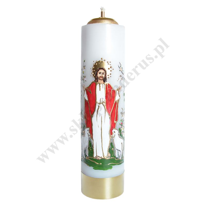 Świeca ołtarzowa z wkładem olejowym o wysokości 30 cm i średnicy 8 cm, zdobiona ręcznie malowaną postacią Pana Jezusa Zmartwychwstałego.