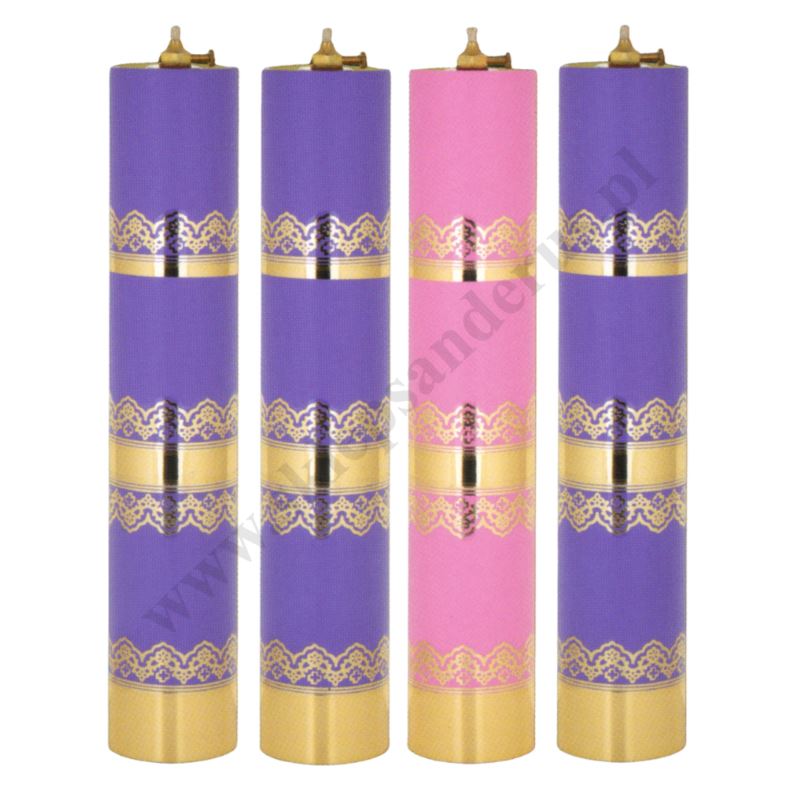 Komplet świec adwentowych w skład którego wchodzą: 3 fioletowe świece i 1 różowa świeca. Świece są wykonane z bardzo trwałego tworzywa z regulowanym wkładem olejowym o pojemności 180ml. Wysokość świecy 40 cm , średnica świecy 75 mm.