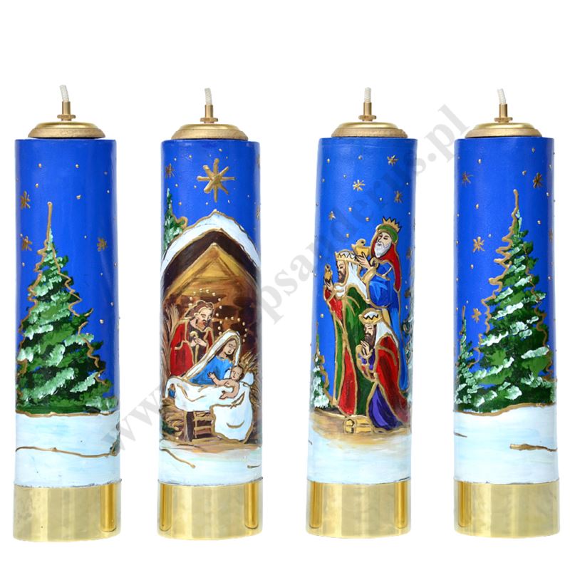 Komplet czterech świec ołtarzowych olejowych z wkładami. Wysokość świecy 30 cm i średnica 8 cm, ręcznie malowanych akcentami bożonarodzeniowymi.