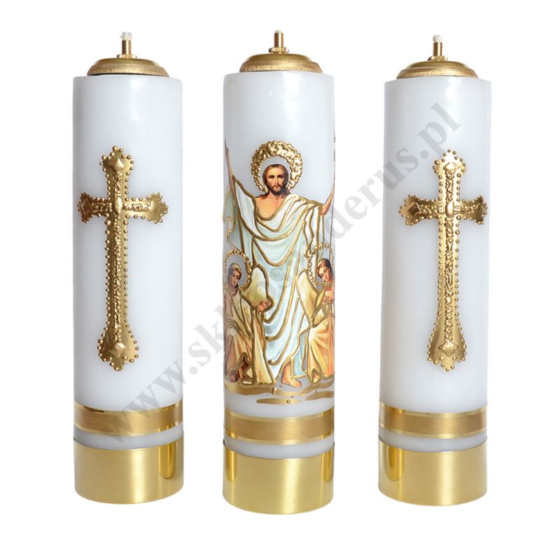 Komplet trzech świec olejowych na Wielkanoc, ręcznie malowane o wysokości 30 cm i średnicy 8 cm, w każdej świecy znajduje się wkład olejowy.
