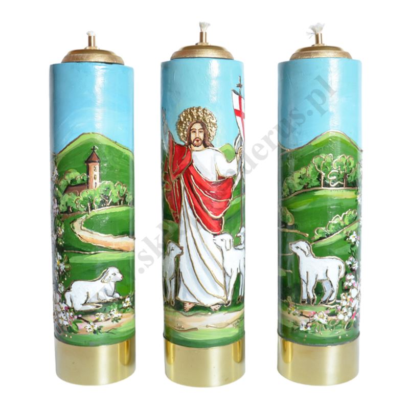 Komplet trzech świec ołtarzowych olejowych z wkładami, ręcznie malowane. Wysokość świecy 30 cm i średnica 8 cm.