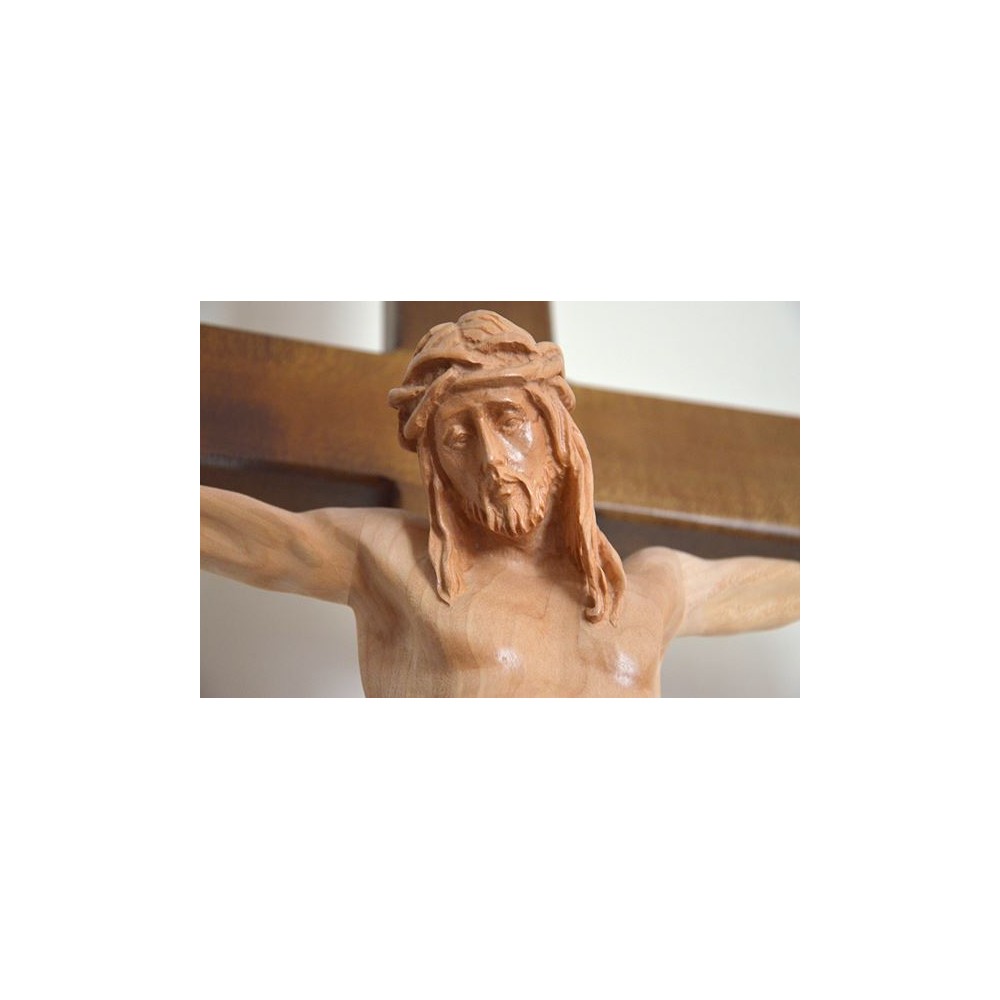 Krzyż ołtarzowo-procesyjny wykonany z drewna, pasyjka rzeźbiona, podstawa rzeźbiona. Krzyż jest wyjmowany z podstawy.