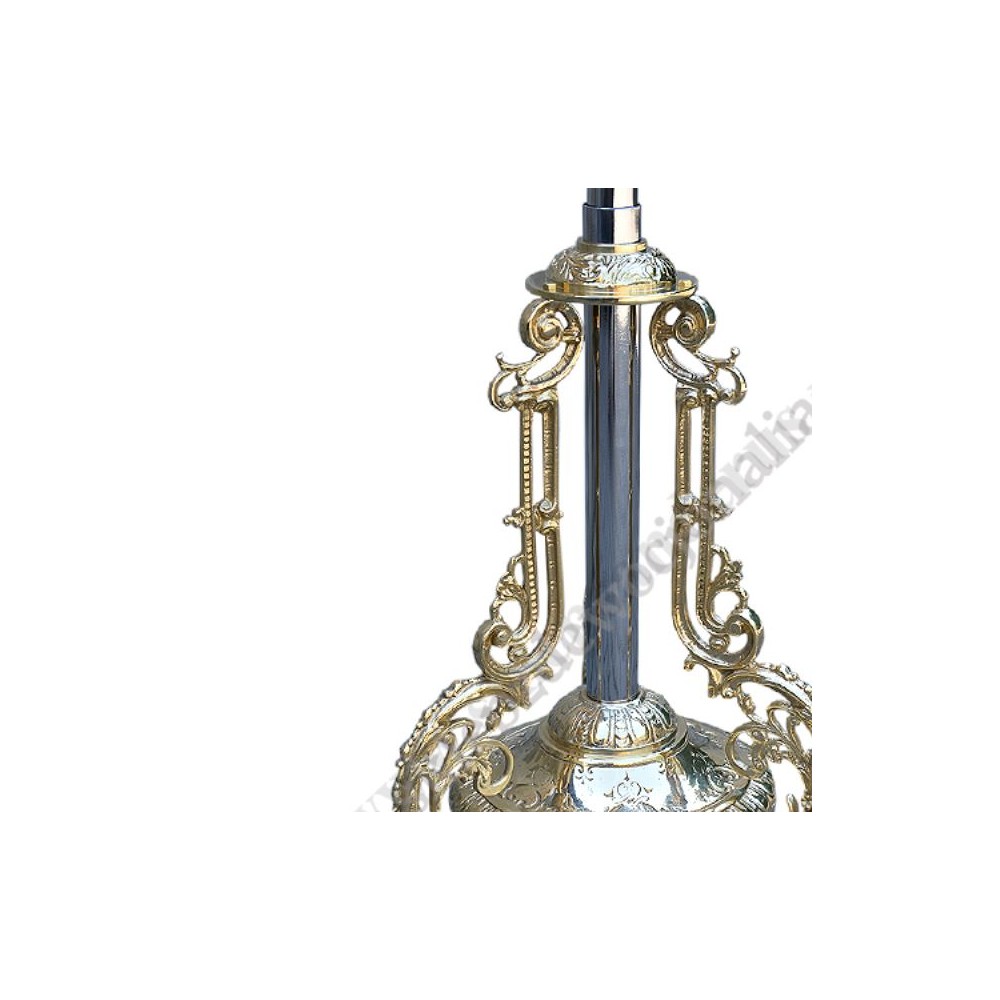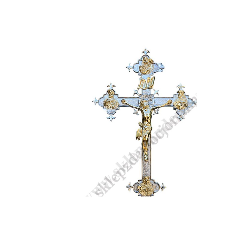 Krzyż mosiężny, niklowany, ołtarzowo-procesyjny z podstawą, wysokość 210 cm, rozpiętość ramion krzyża 31 cm, szerokość w podstawie 35 cm.
