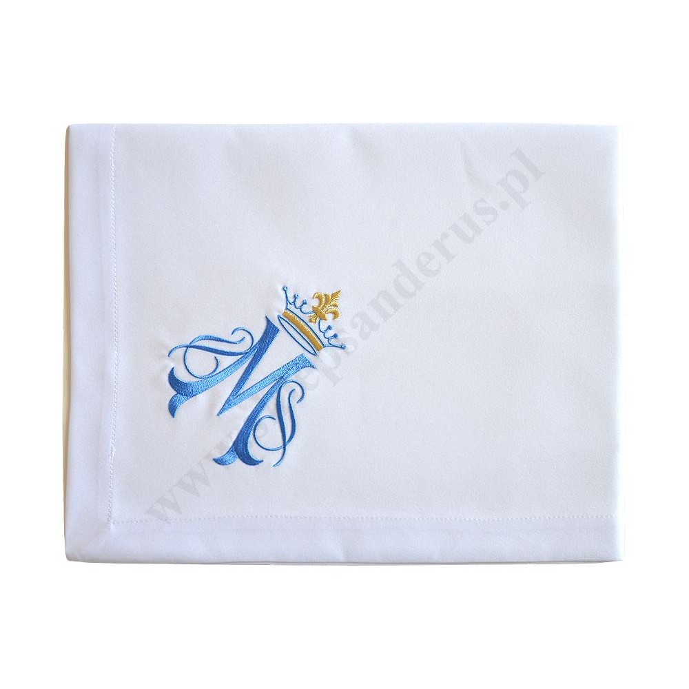 Obrus wykonany z materiału typu poliester zdobiony haftem maryjnym o wymiarach 60 x 60 cm.