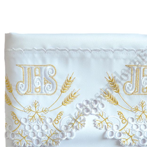 Obrus ołtarzowy z motywem eucharystycznym o wymiarach 3.5 x 1.30 m.