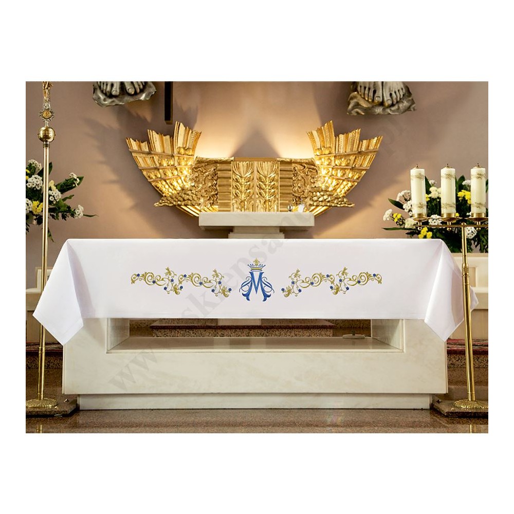 Obrus ołtarzowy z haftowanymi motywami maryjnymi w wymiarze 3.5 x 1.5 m.