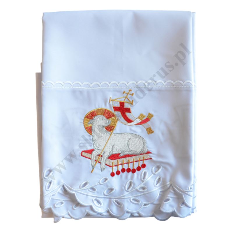 Obrus ołtarzowy wielkanocny z motywem Baranka Wielkanocnego o wymiarach 3 x 1.30 m.