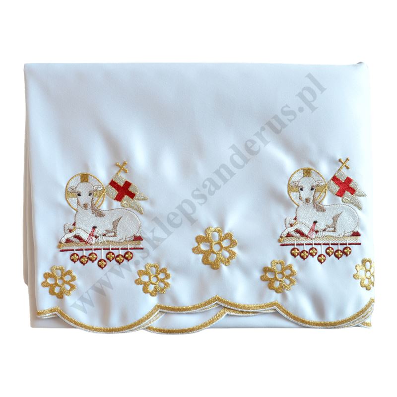 Obrus ołtarzowy z motywem baranka wielkanocnego o wymiarach 3.00 x 1.50 m.