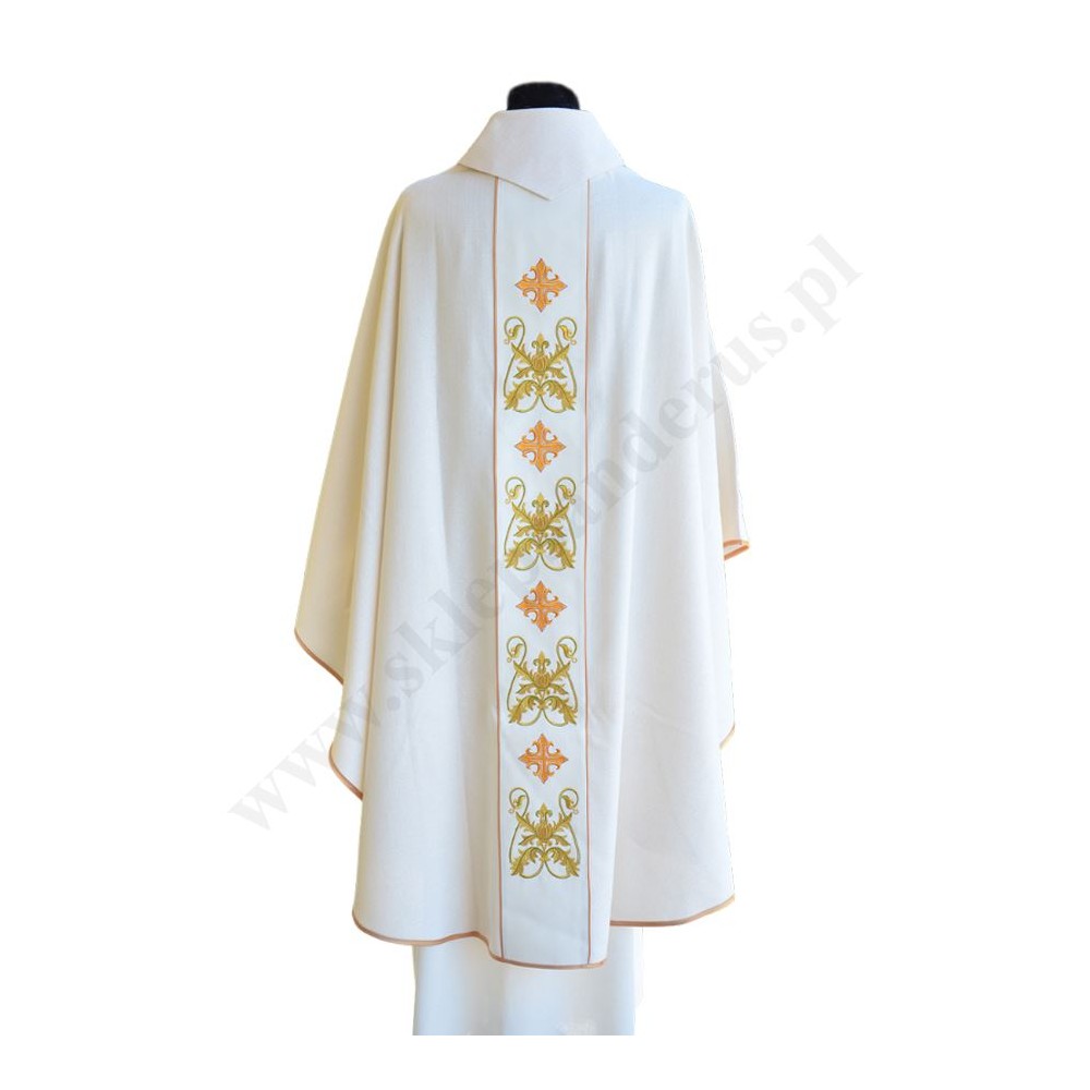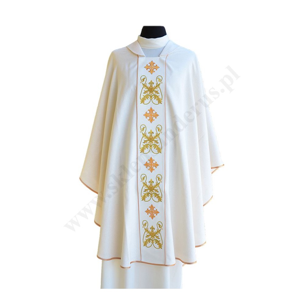 Ornat z pasem zdobionym haftami krzyży oraz motywami florystycznymi.