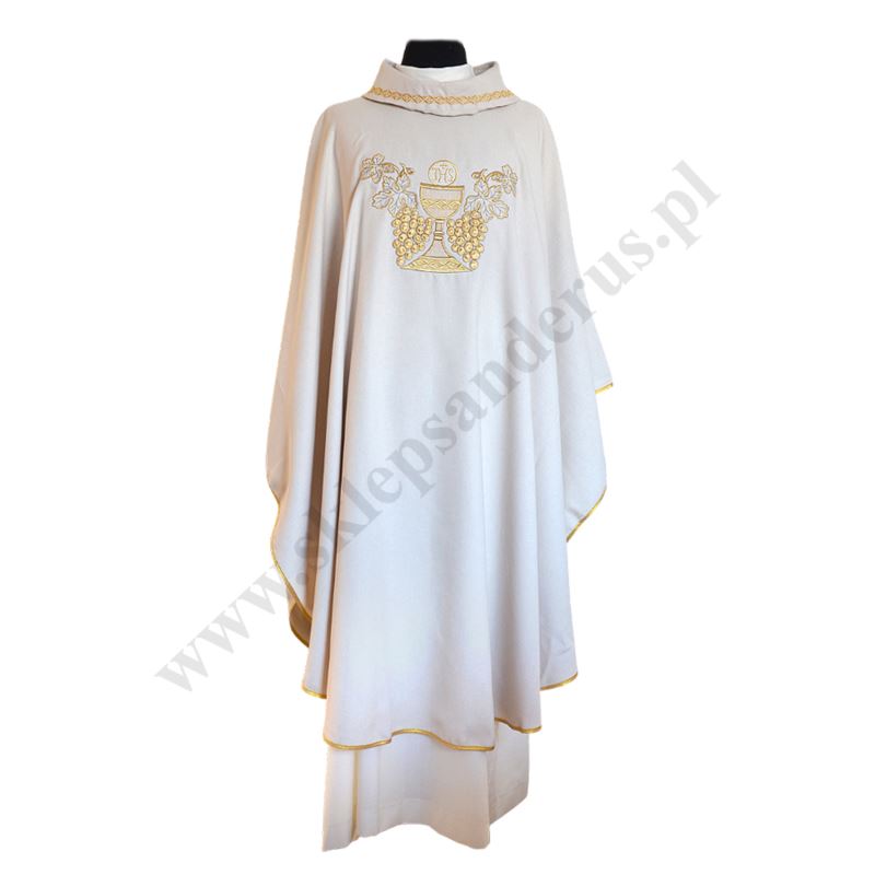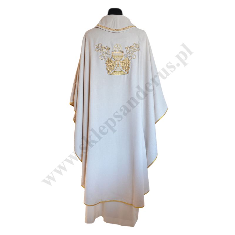 Ornat w kolorze ecri zdobiony haftami eucharystycznymi, wykonany z materiału zawierającego 100% poliester.