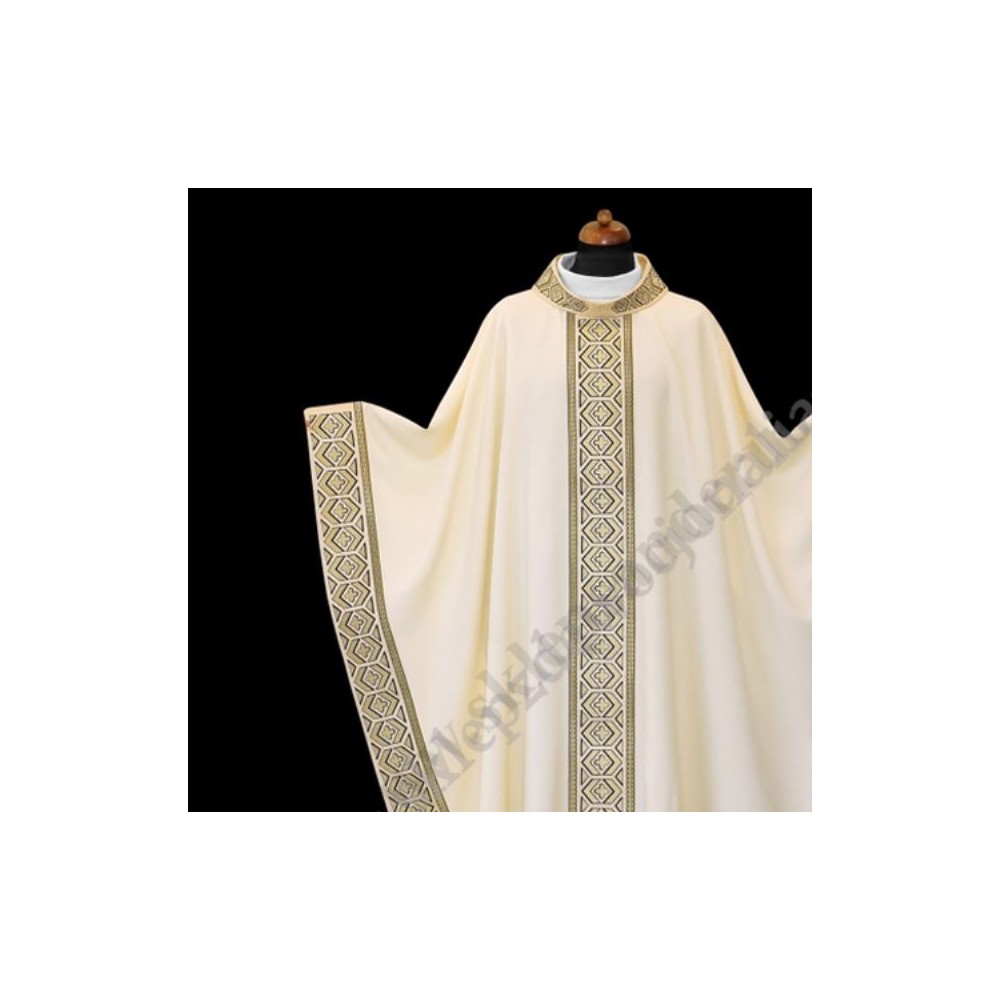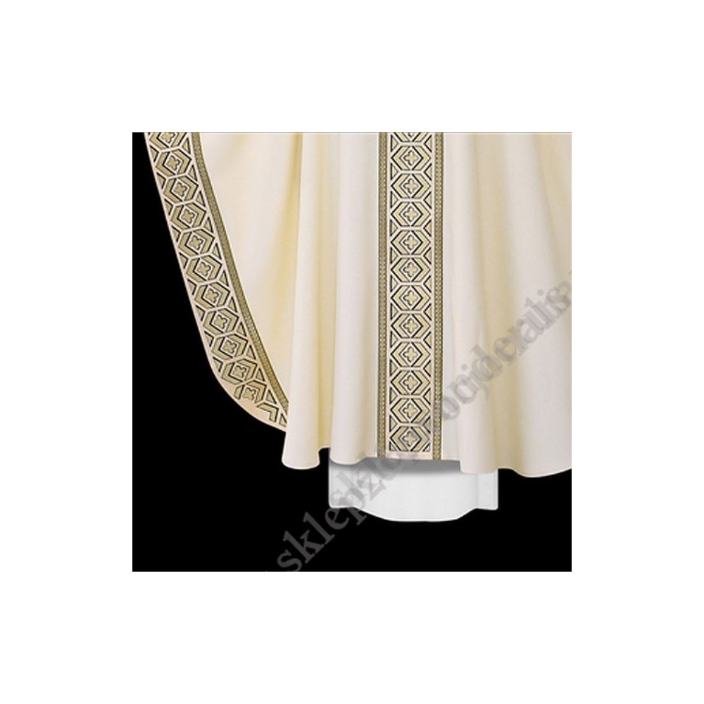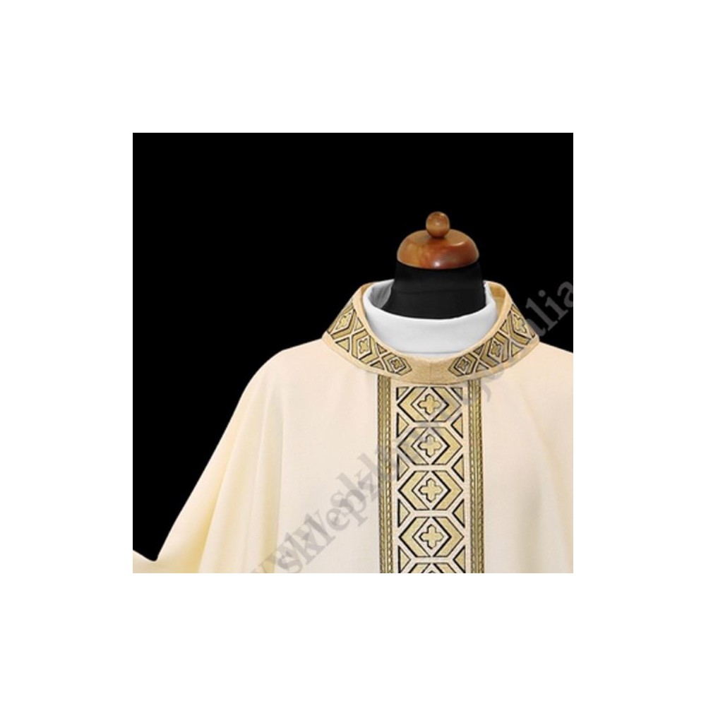 Elegancki ornat w stylu monastycznym z haftowanym kołnierzem i bokami ze stułą wewnętrzną. Szata uszyta z lekkiej tkaniny z bogatym haftem na pasie i ozdobiona złotą pasmanterią.