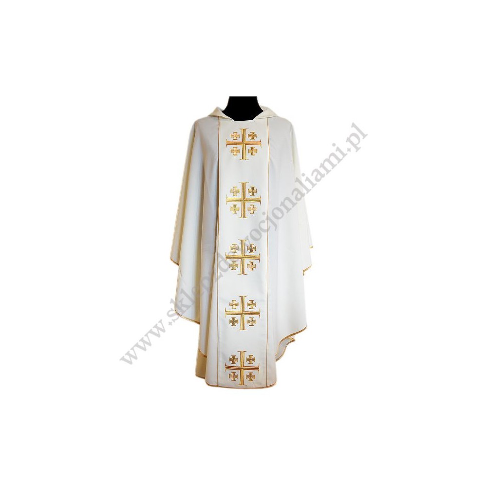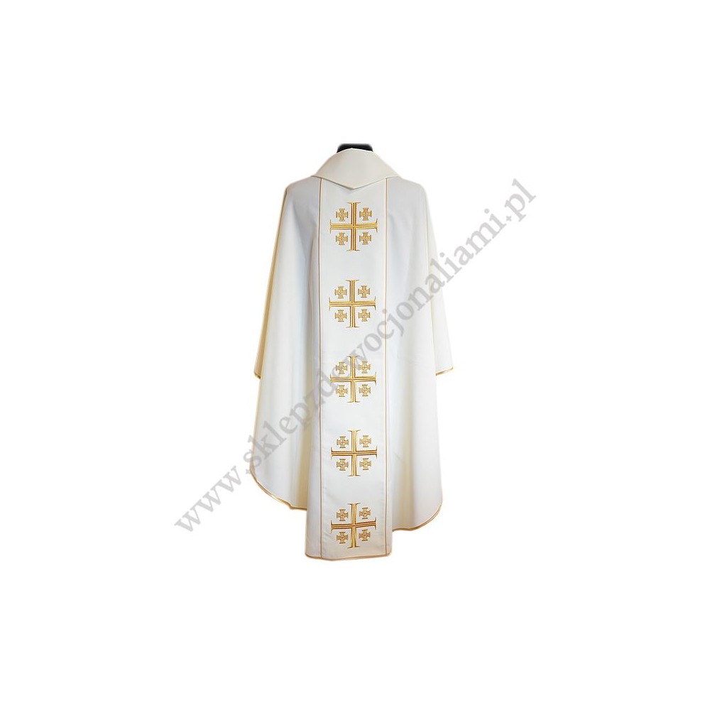 Ornat z pasami haftowanymi komputerowo. Wykonany z lekkiego i przyjemnego w dotyku materiału. W komplecie stuła wewnętrzna.