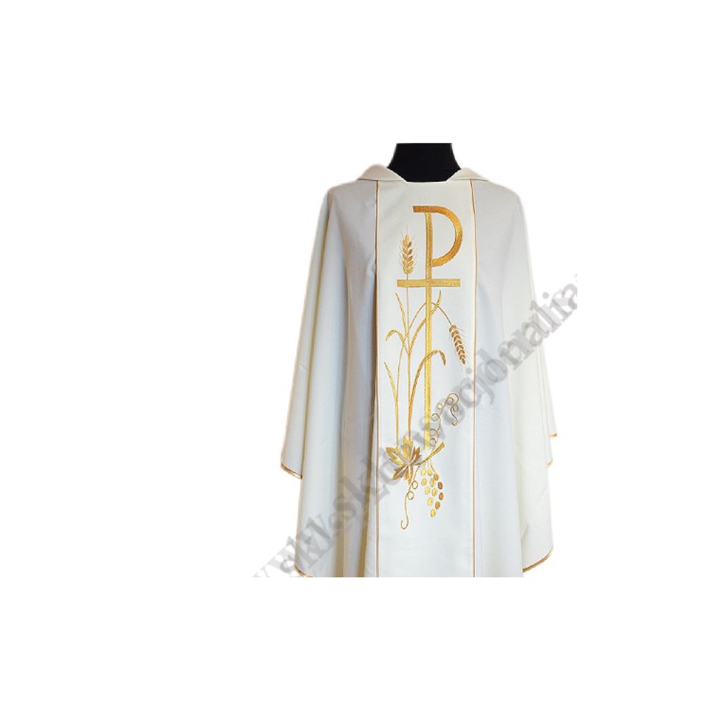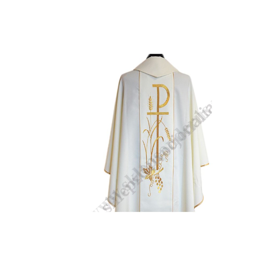 Ornat z pasami haftowanymi komputerowo. Wykonany z lekkiego i przyjemnego w dotyku materiału. W komplecie stuła wewnętrzna.