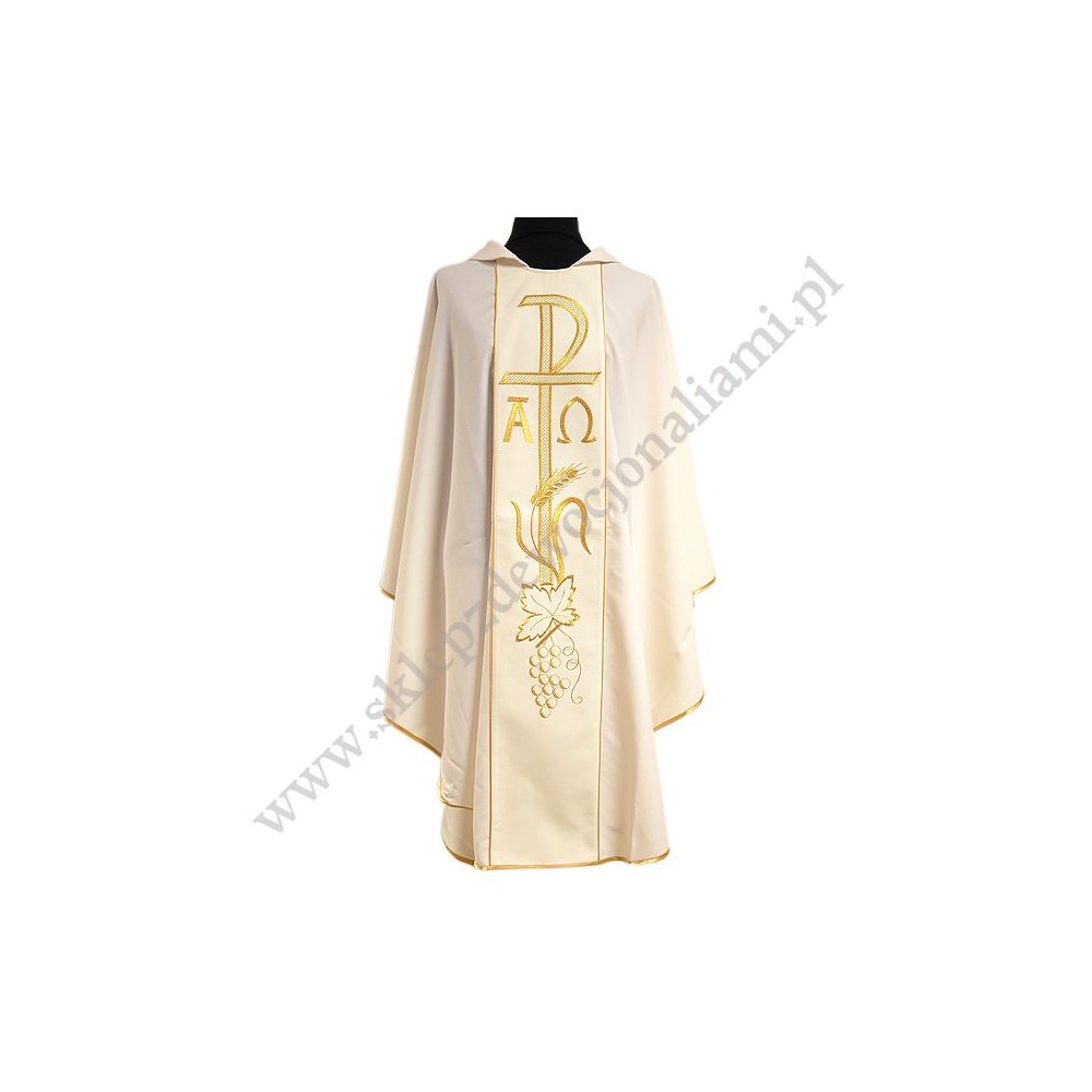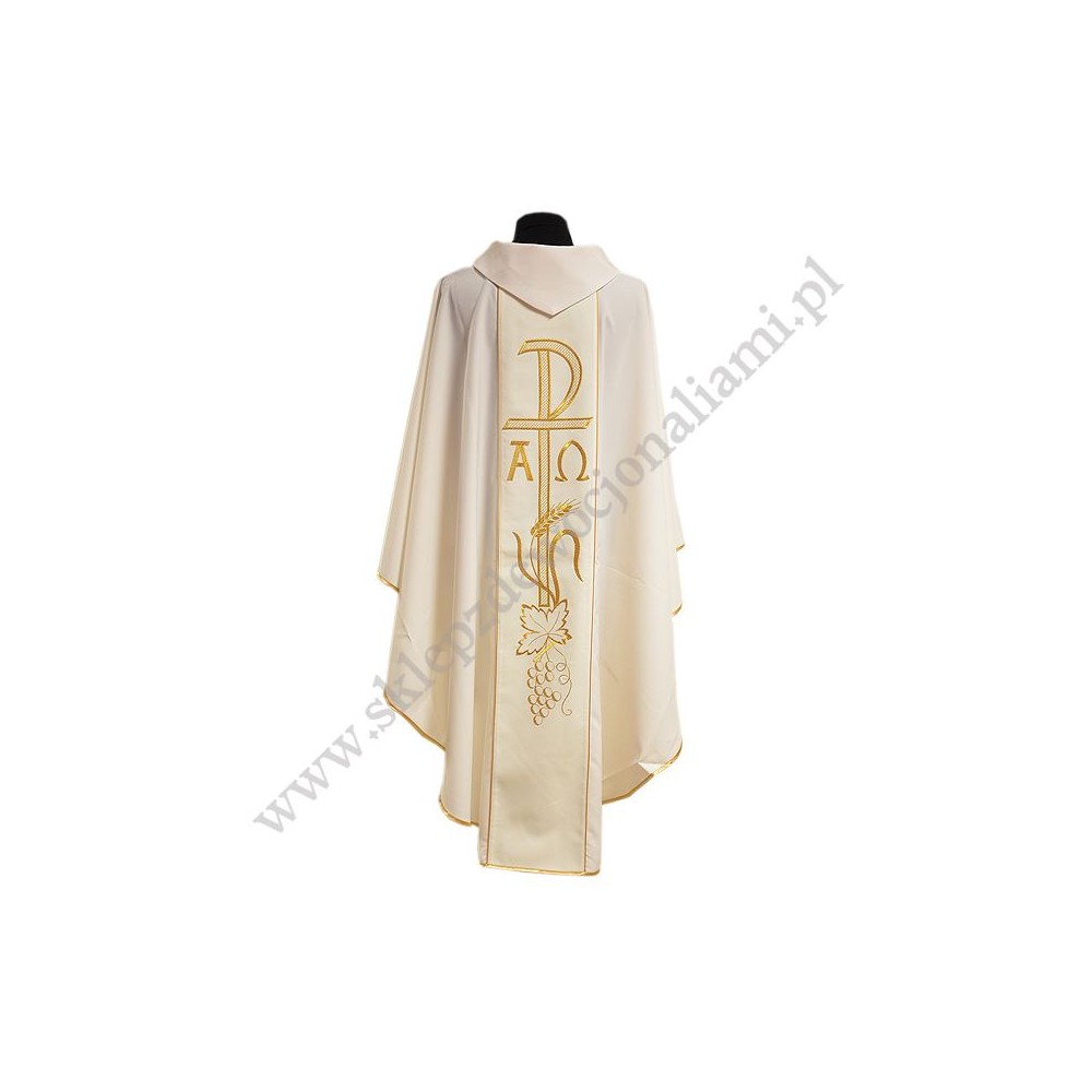 Ornat z pasami haftowanymi komputerowo. Wykonany z lekkiego i przyjemnego w dotyku materiału. W komplecie stuła wewnętrzna.