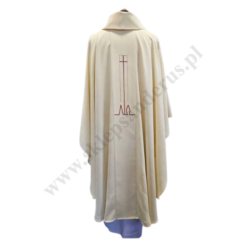 Ornat kremowy haftowany z symbolem Baranka na okres Wielkanocny. Szata liturgiczna uszyta z lekkiej tkaniny kremowej ze stułą wewnętrzną do kompletu. Prosty i nowoczesny haft Baranka na pasie stanowi główny element szaty liturgicznej. Tył ornatu ozdobiony haftem krzyża i symbolem A Ω.
