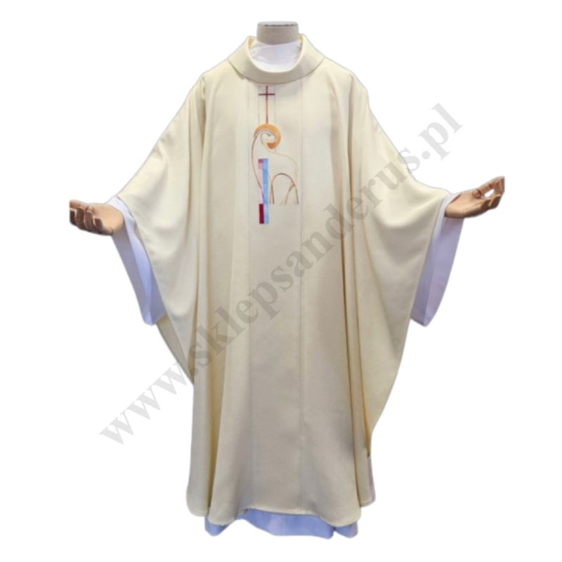Ornat kremowy haftowany z symbolem Baranka na okres Wielkanocny. Szata liturgiczna uszyta z lekkiej tkaniny kremowej ze stułą wewnętrzną do kompletu. Prosty i nowoczesny haft Baranka na pasie stanowi główny element szaty liturgicznej.