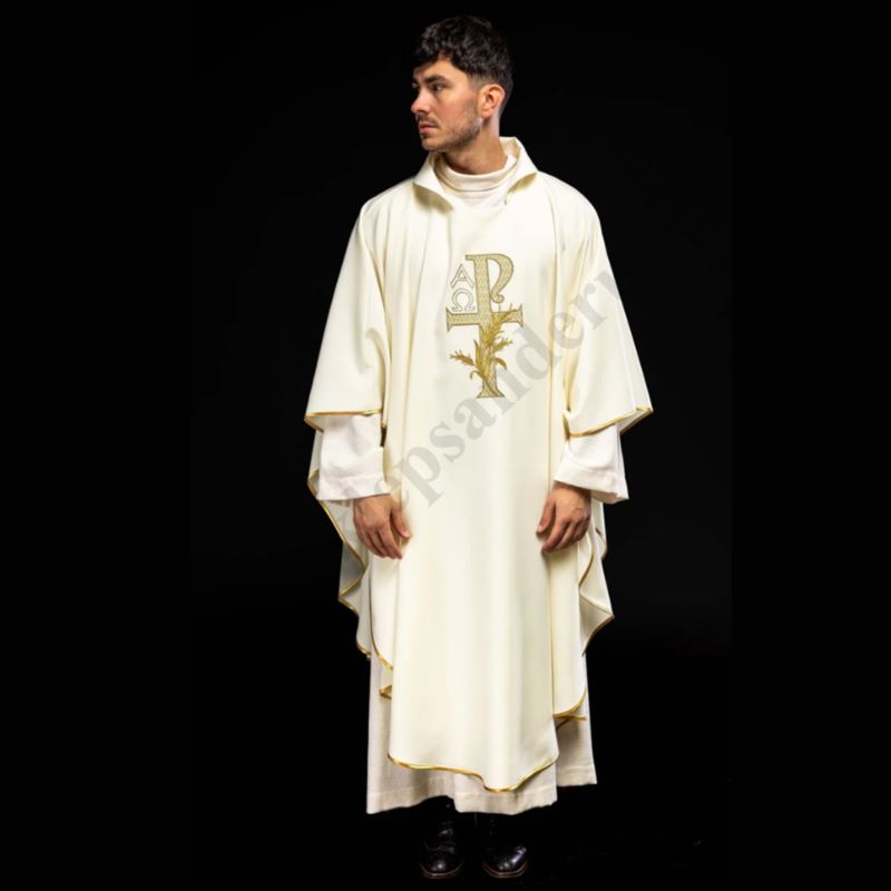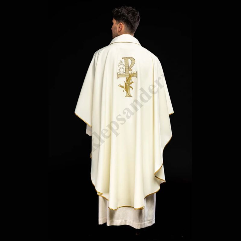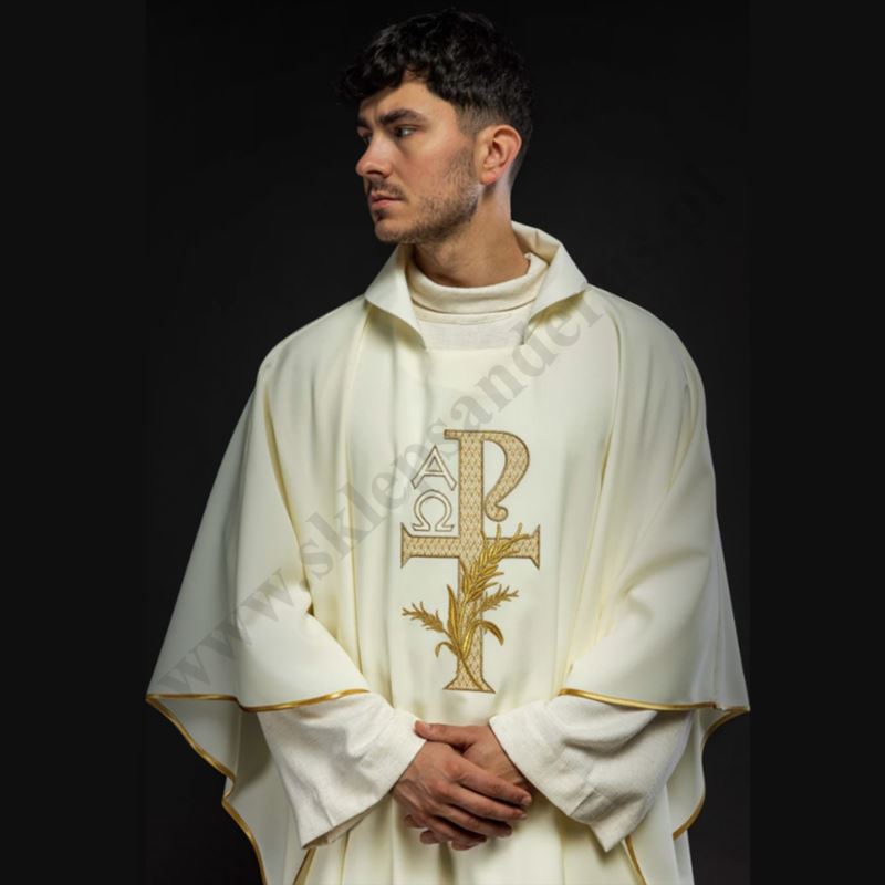 Nasz ornat, mistrzowsko wykonany z wysokiej jakości tkaniny, jest uosobieniem elegancji i głębokiego symbolizmu liturgicznego. Zdobiony haftem z symbolem eucharystycznym, wykonanym złotymi nićmi, który przedstawia krzyż, nasz ornat emanuje majestatem i pięknem. Satynowa, złota lamówka idealnie komponuje się z wyhaftowanym krzyżem, dodając szacie liturgicznej wyjątkowego blasku.
