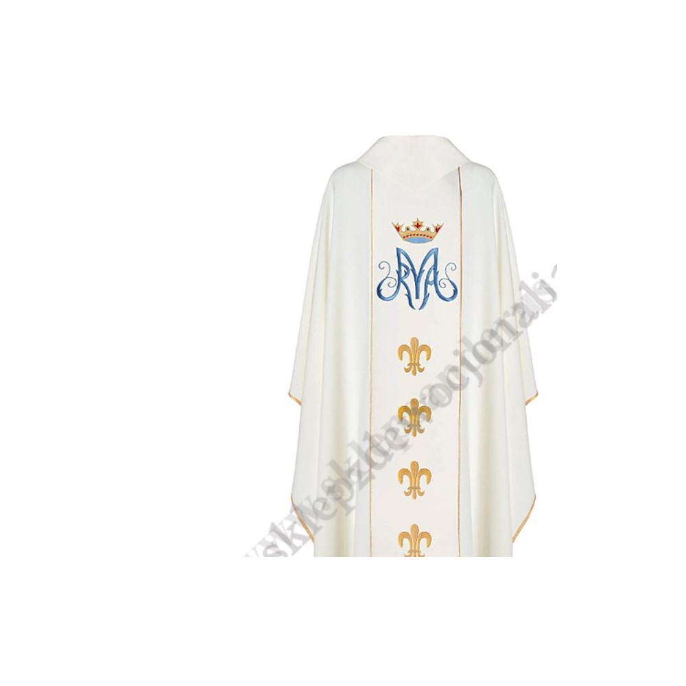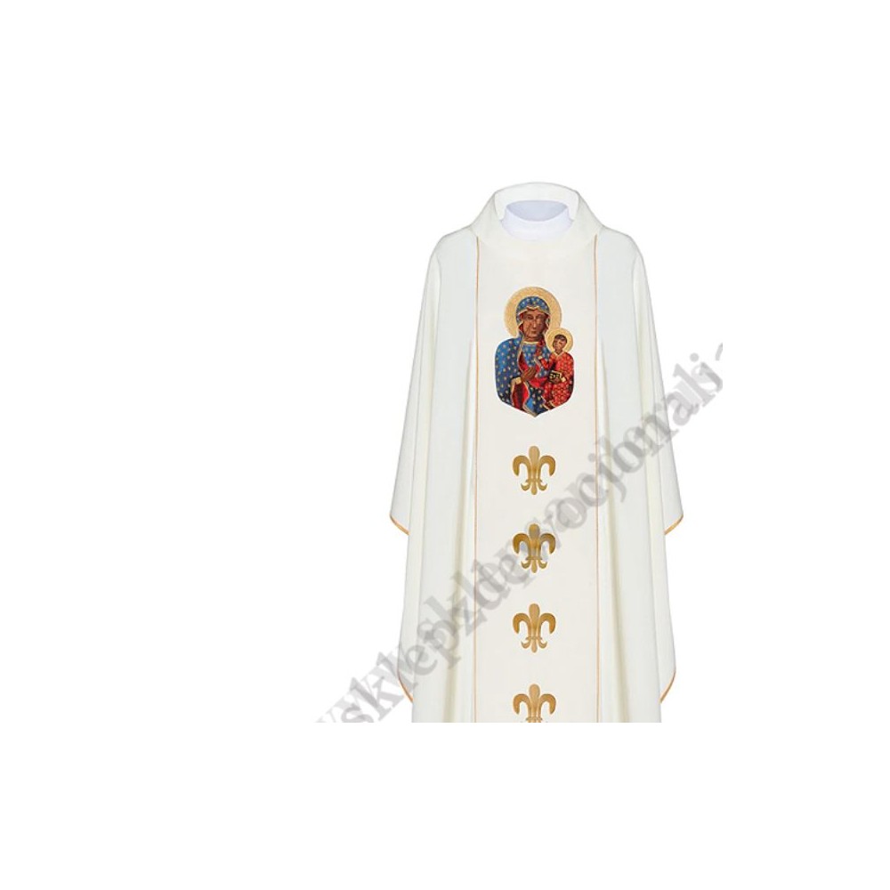 Ornat wykonany z wysokiej jakości tkaniny gładkiej, zdobiony pasem z haftowanym z wizerunkiem Matki Boskiej Częstochowskiej. Całość wykończona złoto-satynową lamówką.