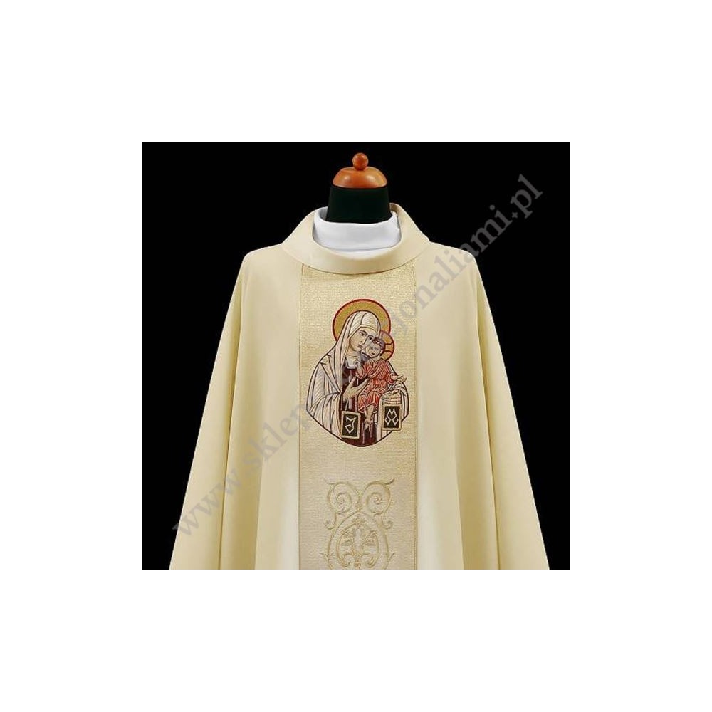 Ornat Maryjny haftowany uszyty z lekkiej tkaniny z wizerunkiem Matki Bożej z Góry Karmel.